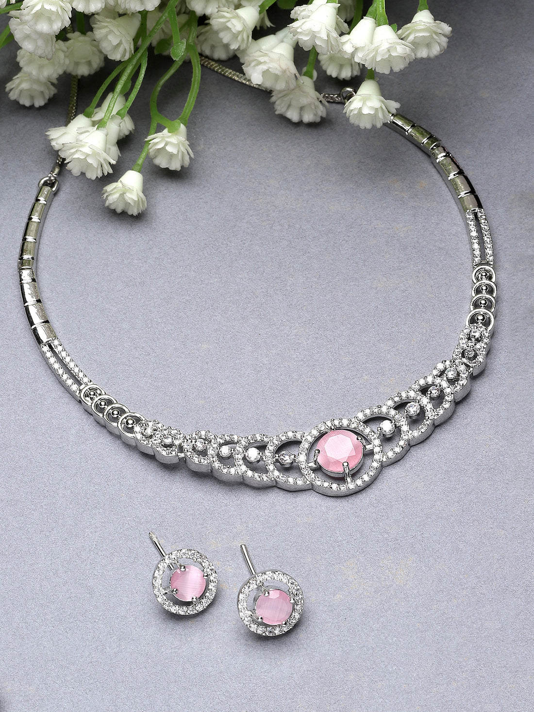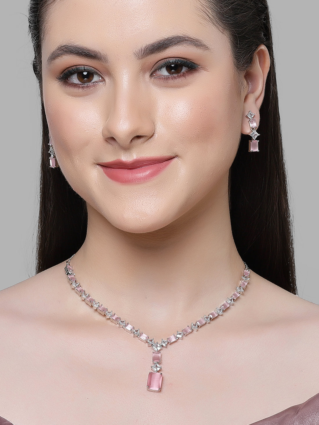 Silver Tone Pink AD Necklace Set for Women. It is made with High-Quality AAA Cubic...