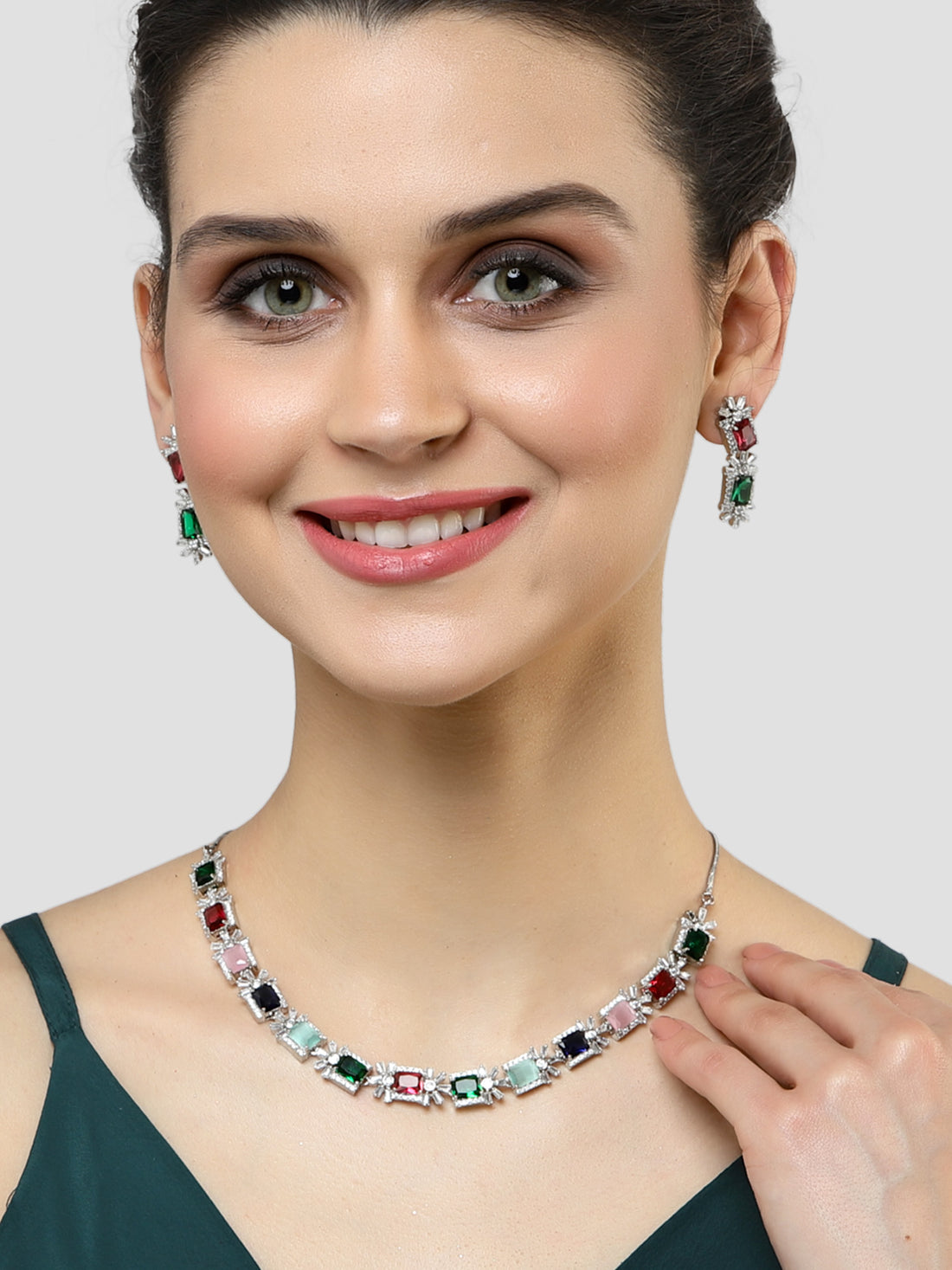 Karatcart Silver Tone Multicolor Cubic Zirconia Studded Necklace Set