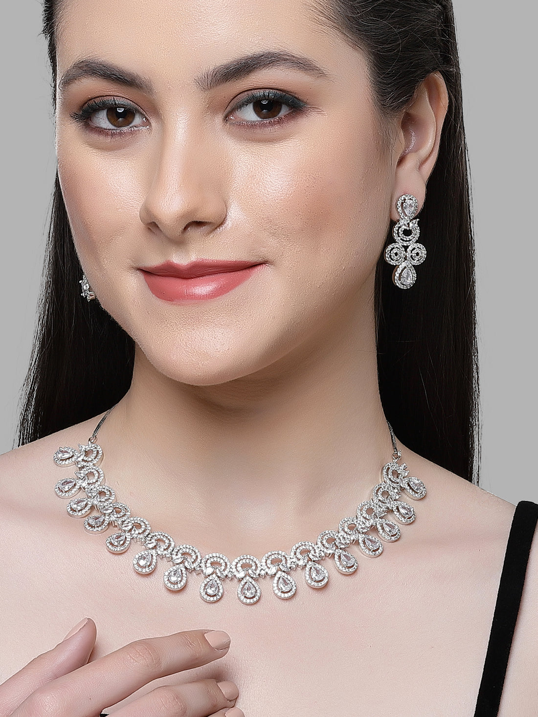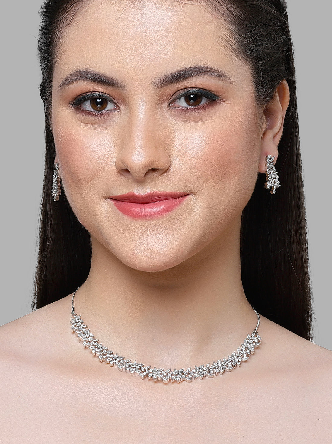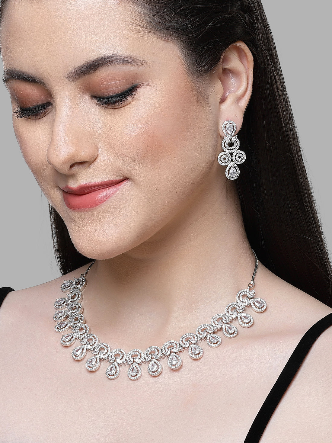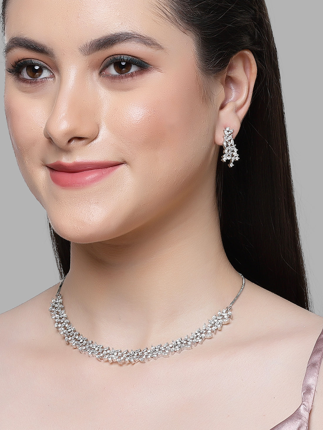 Silver Tone American Diamond Studded Necklace Set For Women. It is made with High-Quality AAA...