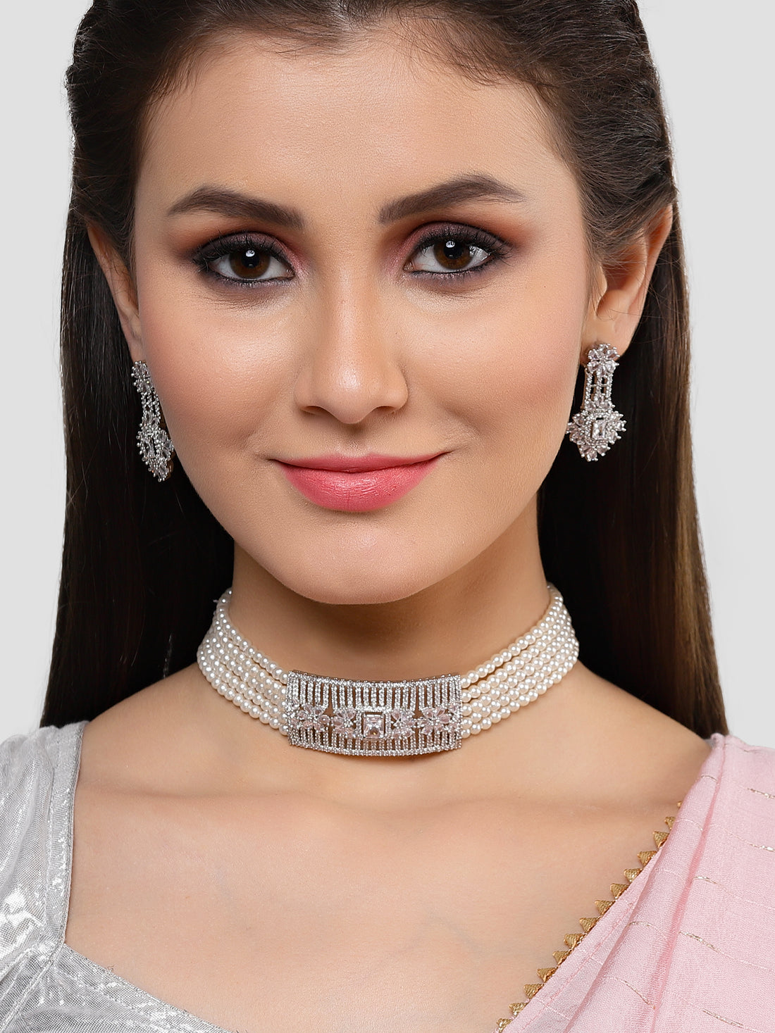Karatcart Silver Tone Pearl Beaded Pink Cubic Zirconia Choker Necklace Set for Women