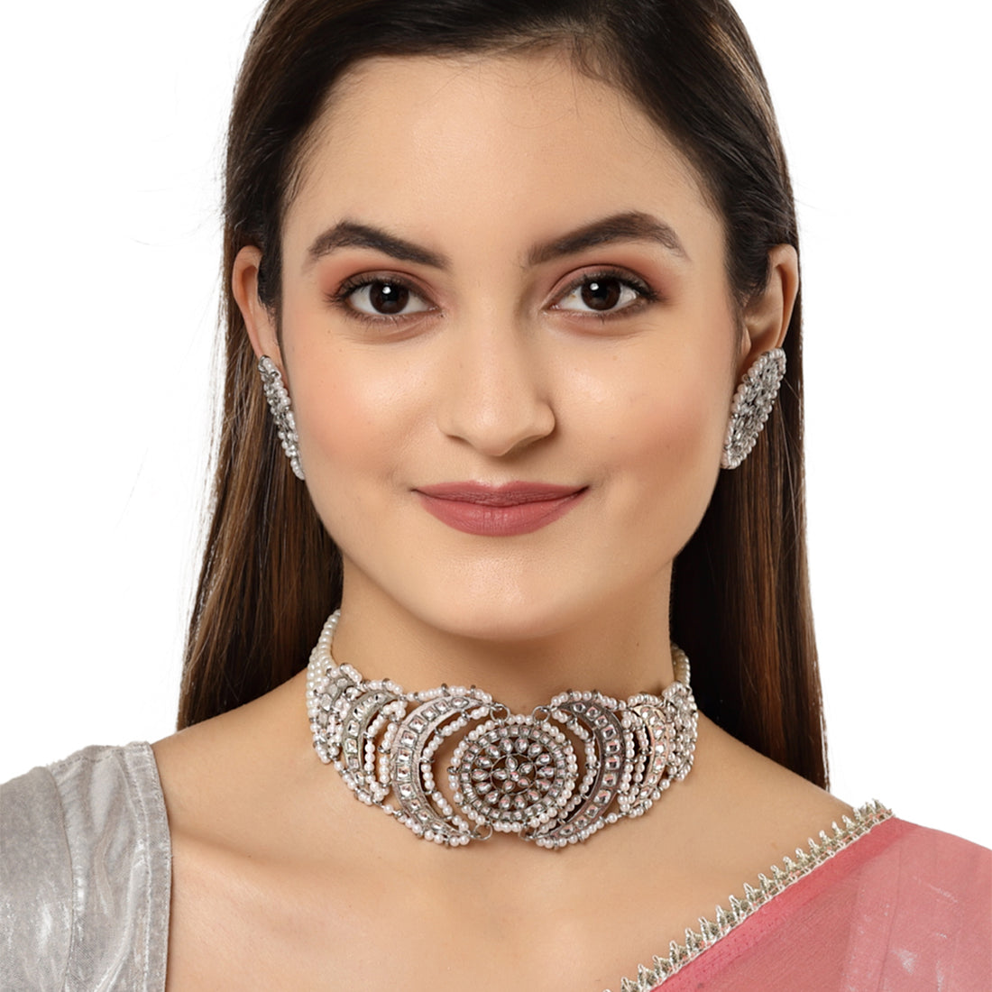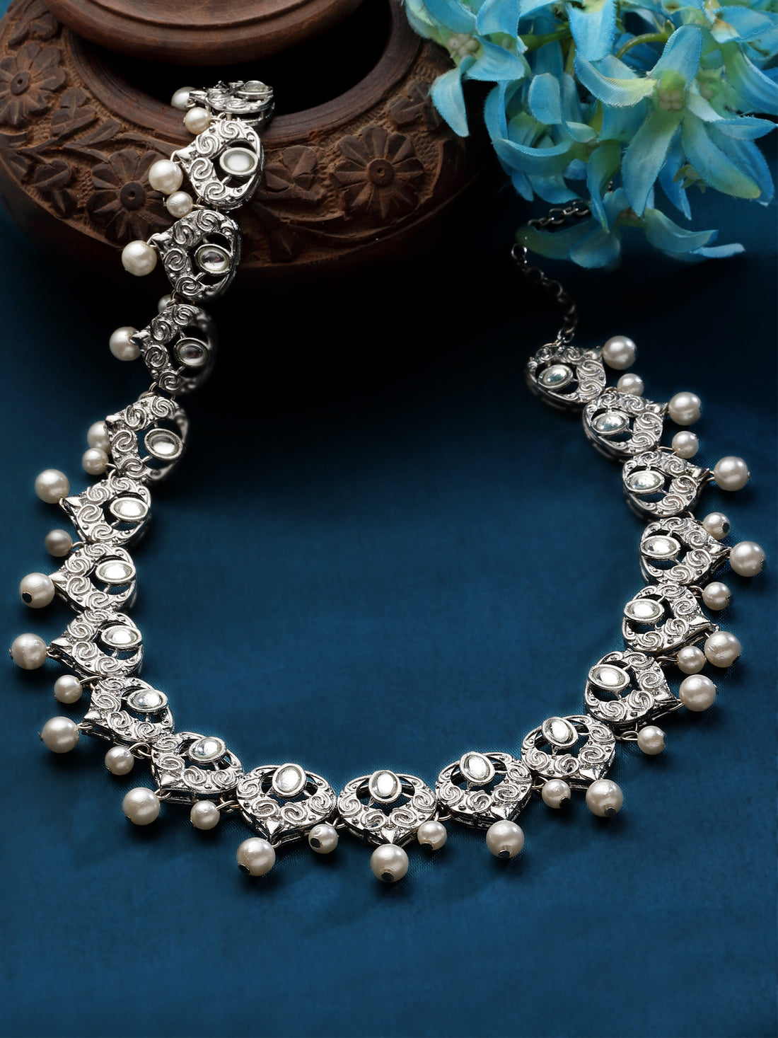 Karatcart Oxidised Silver Pearl Studded Floral Kundan Choker Neckalce Set