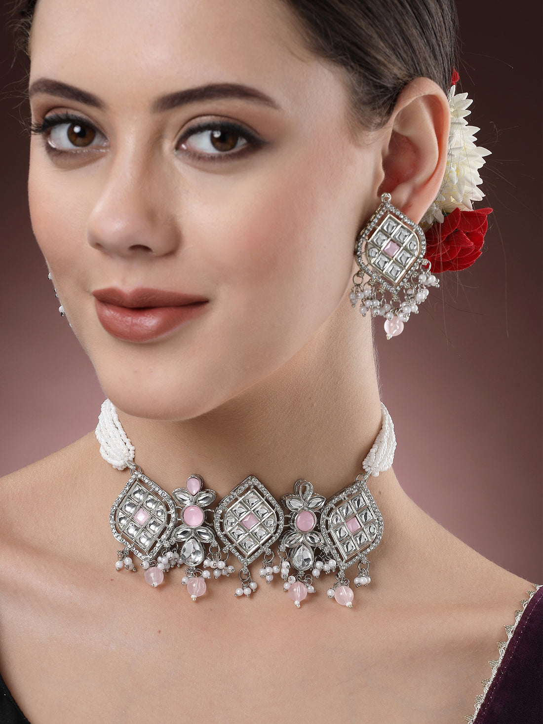 Karatcart Oxidised Silver Pink Stone Kundan Choker Necklace Set for Women