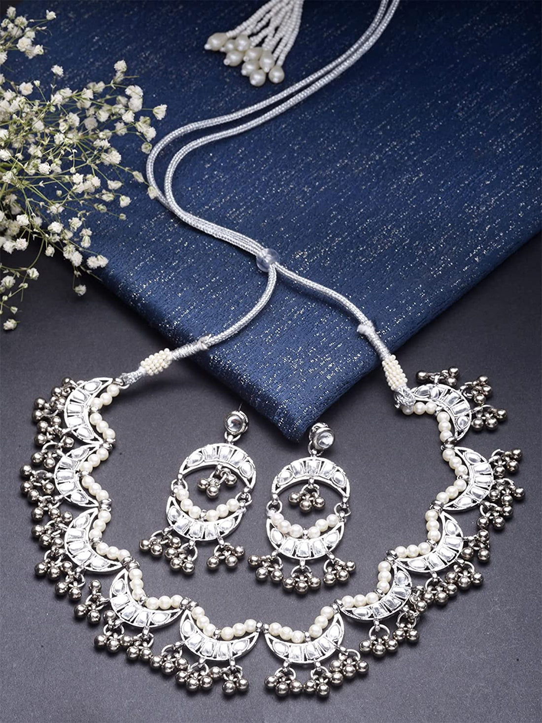 Karatcart Oxidised Silver Pearl Kundan Choker Necklace Set. It is made with high-quality Kundan Stones...