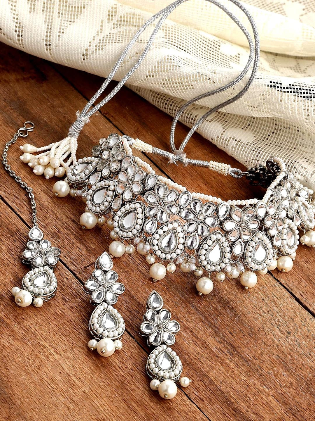 Karatcart Oxidised Silver Pearl Studded Floral Kundan Choker Neckalce Set. It is made with high-quality...