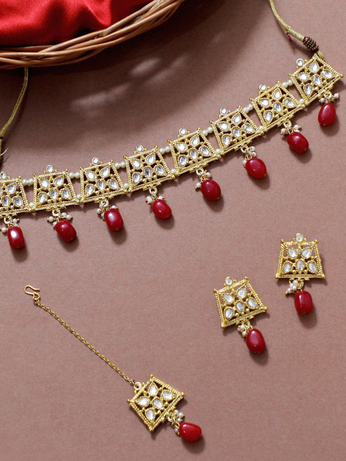 Red Beads Gold-Toned Kundan Studded Bridal Choker Necklace Set