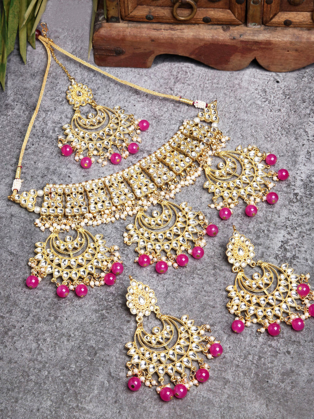 Pink Beads Gold-Toned Kundan Studded Bridal Choker Necklace Set