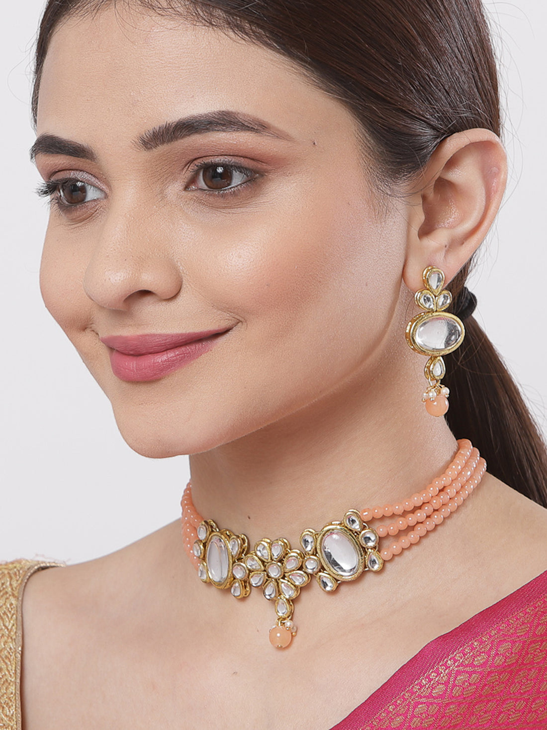 Peach Beads Studded Kundan Choker Necklace with Earrings and Maangtikka. It's Five Layer Micro Gold Plated...