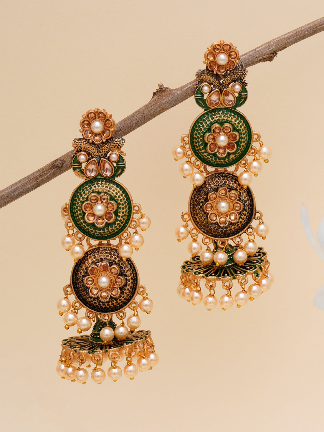 Karatcart Gold Plated Antique Floral Design Green Drop Earrings for Women