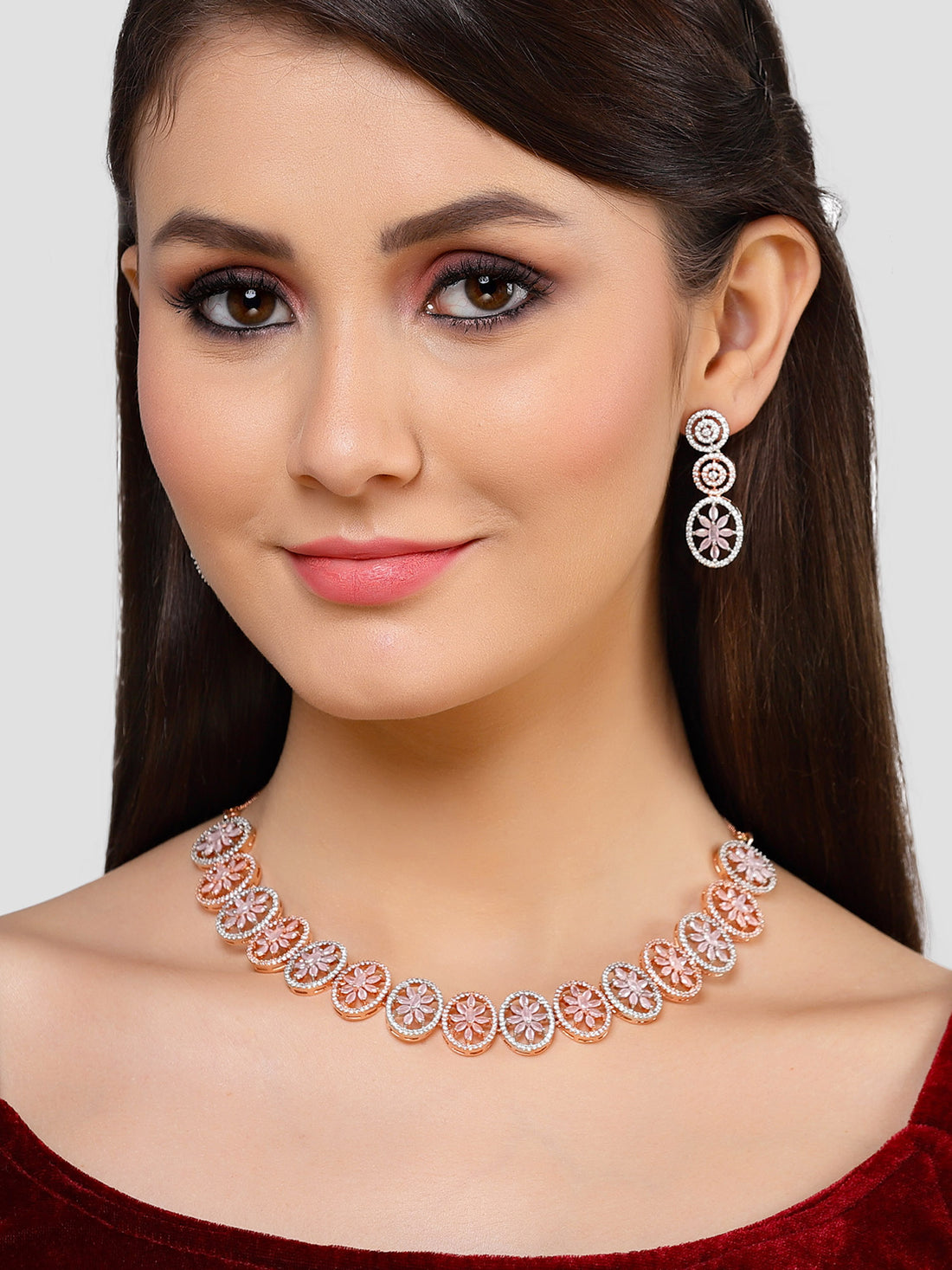 Karatcart Rose Gold Plated Floral Design Pink Cubic Zirconia Studded Necklace Set