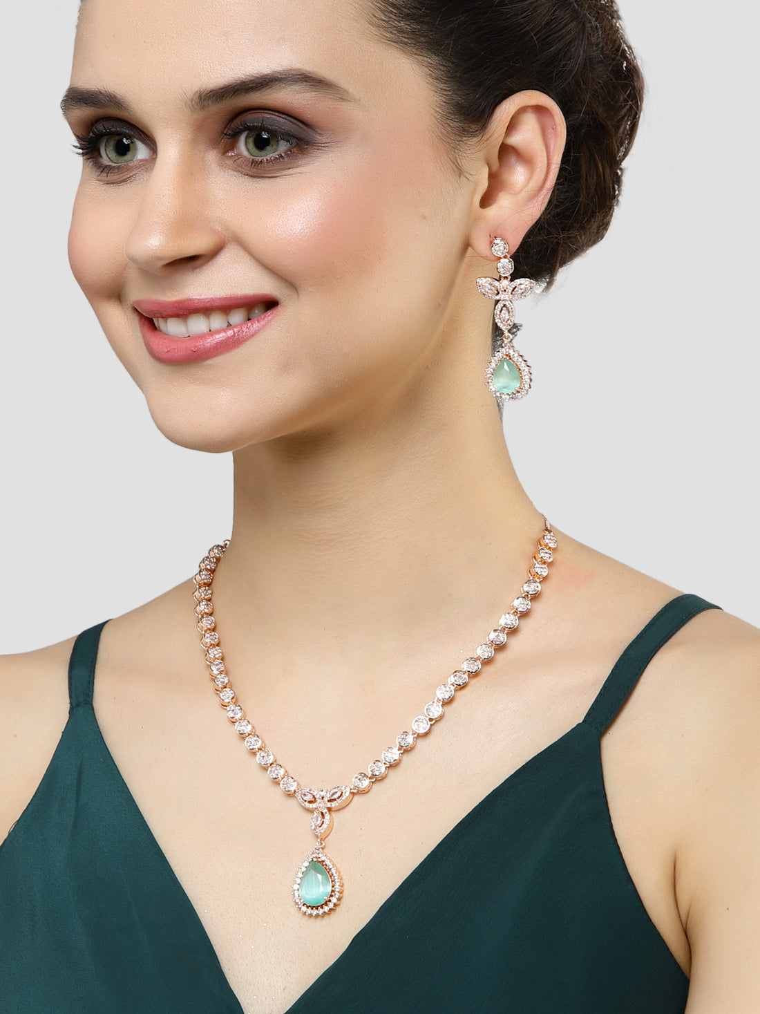 Karatcart Rose Gold Plated Drop Shape Light Green Cubic Zirconia Studded Necklace Set