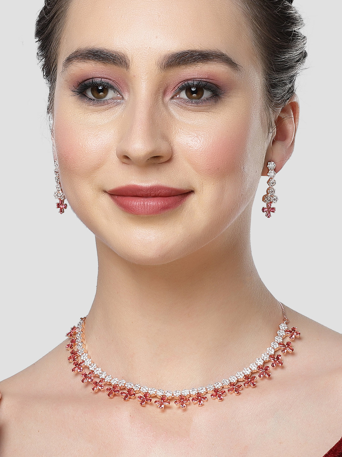 Karatcart Rose Gold Plated Red Cubic Zirconia Studded Floral Design Necklace Set for Women