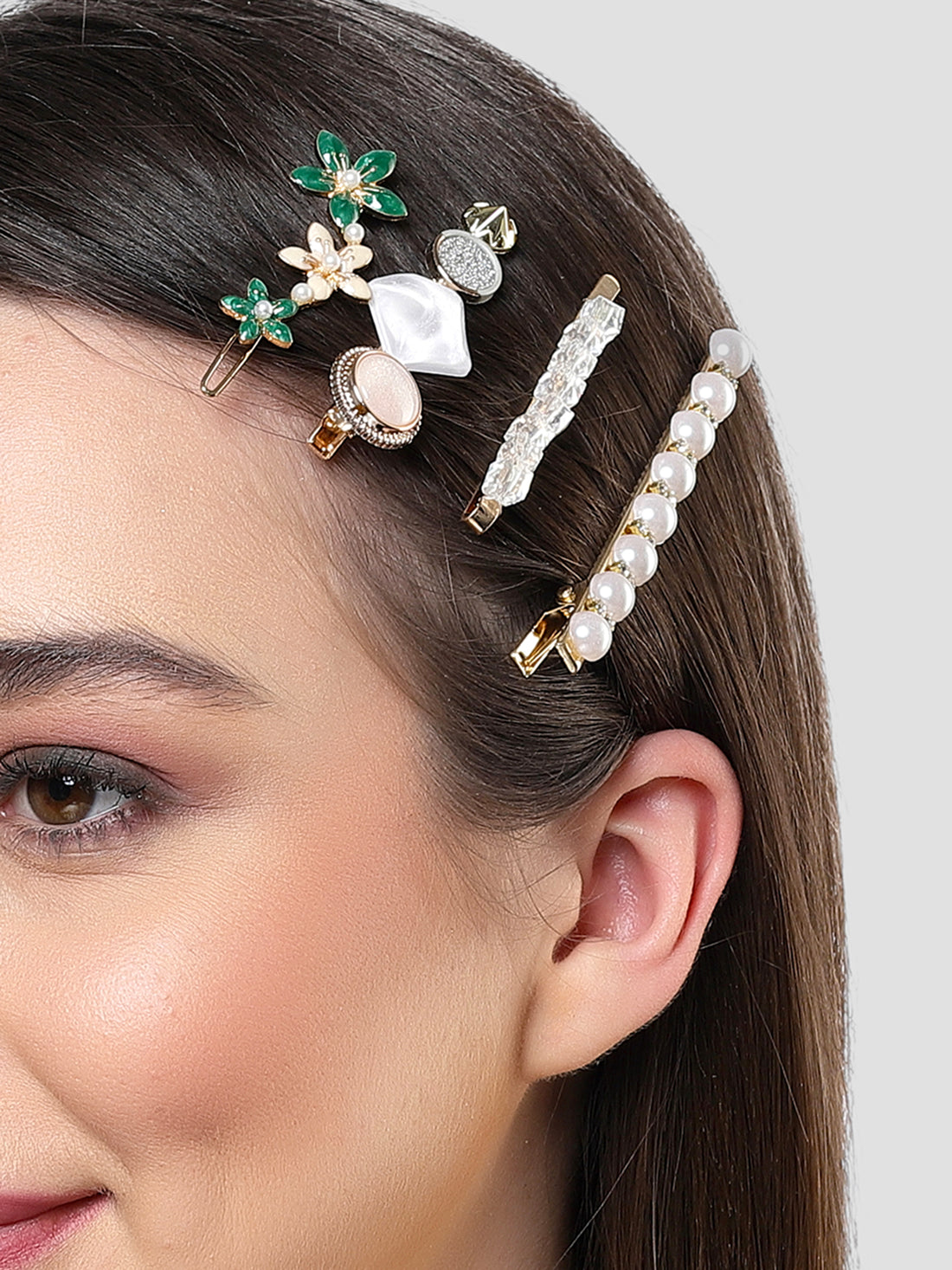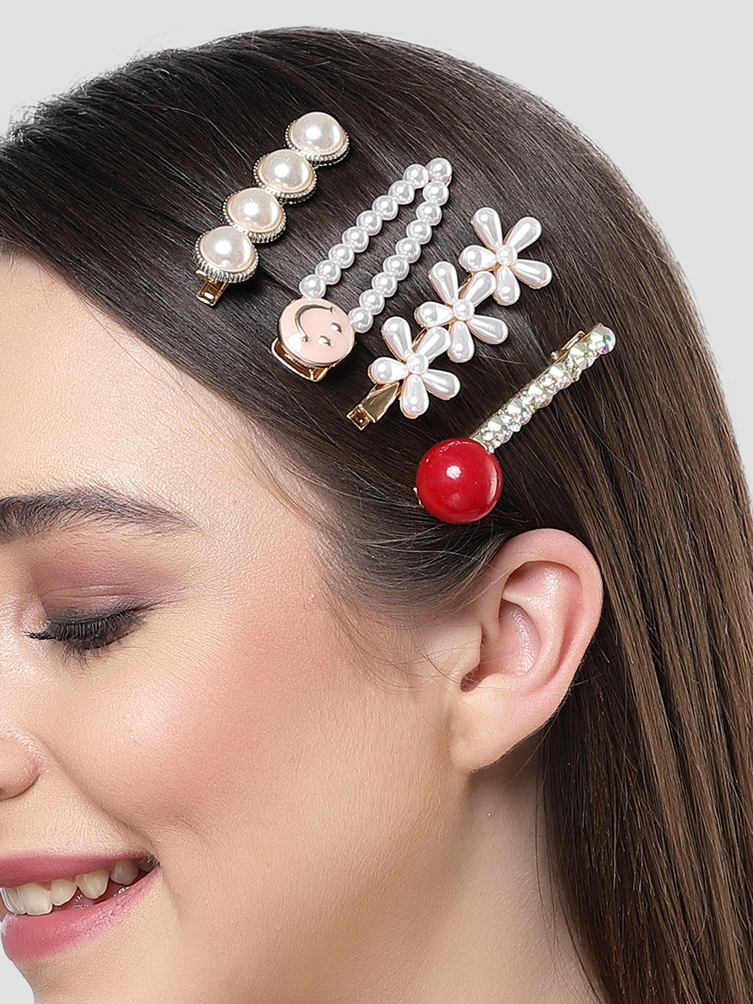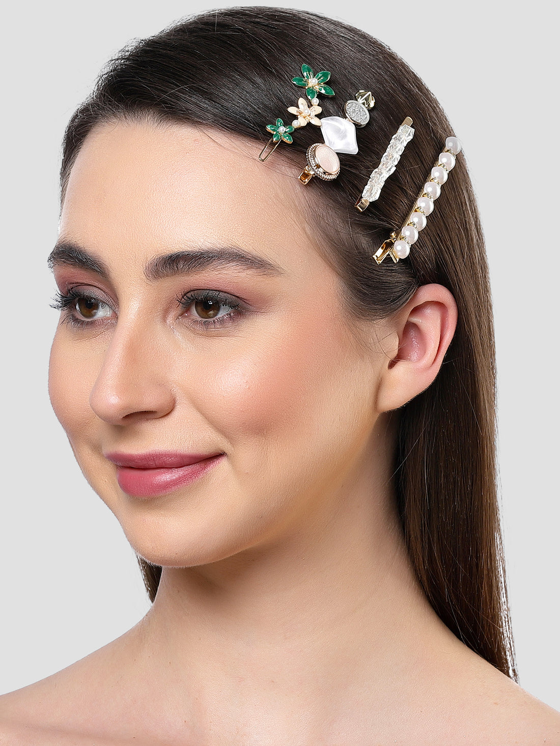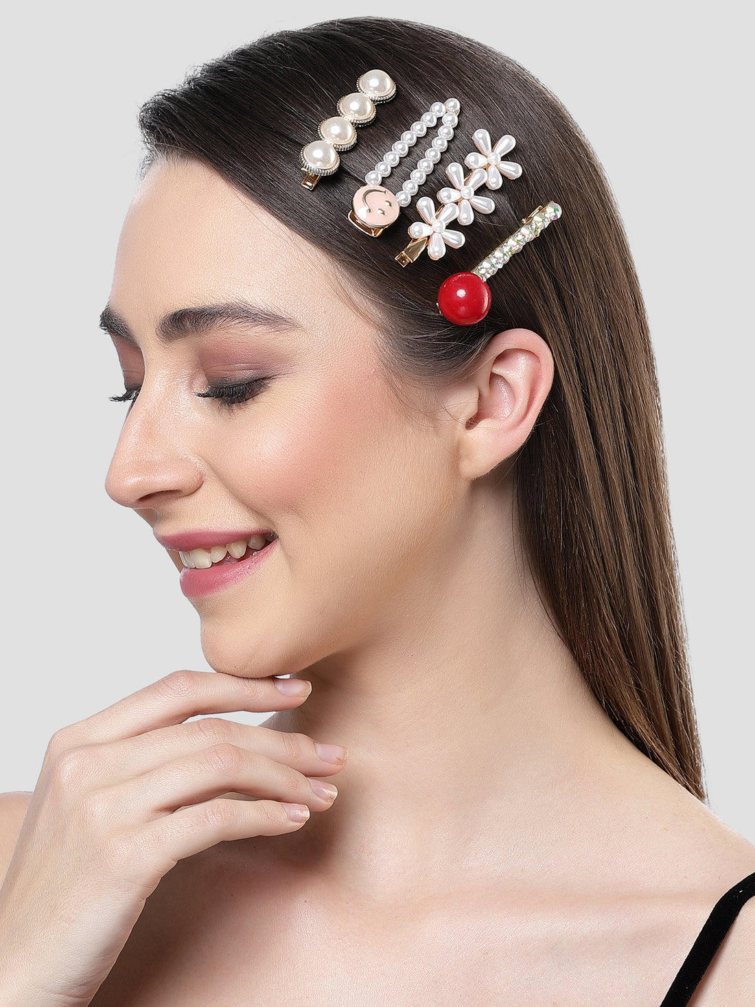Bohey by KARATCART Set of 5 White Crystal Studded Hair Clips for Women