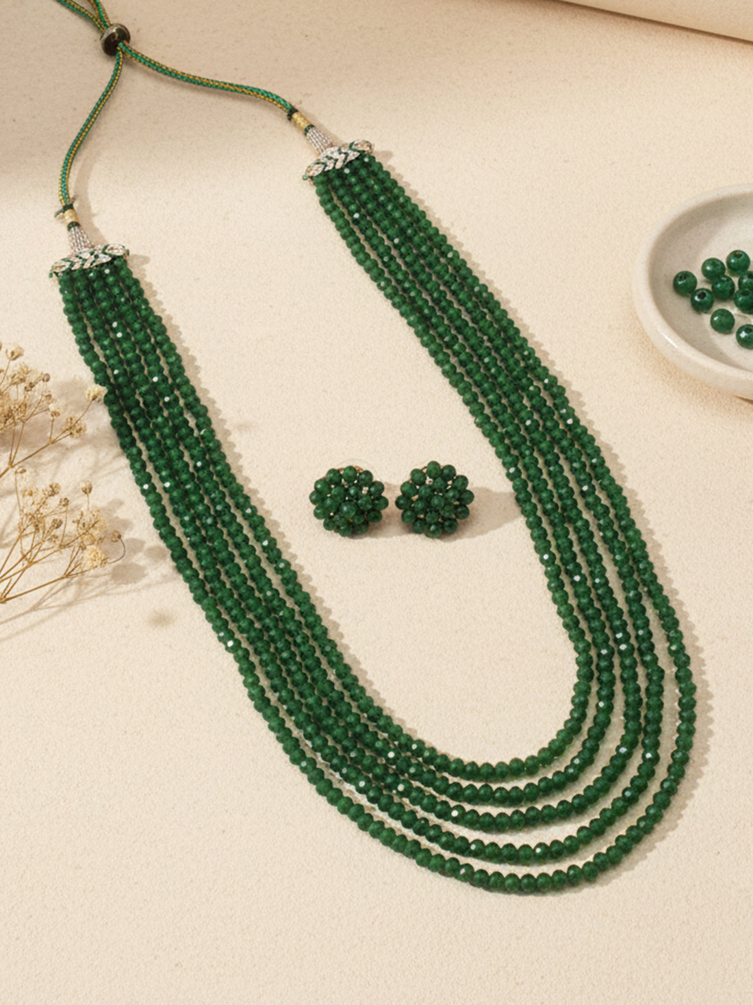 Green Crystal Beads Multi-Strand Rani Haar Necklace Set