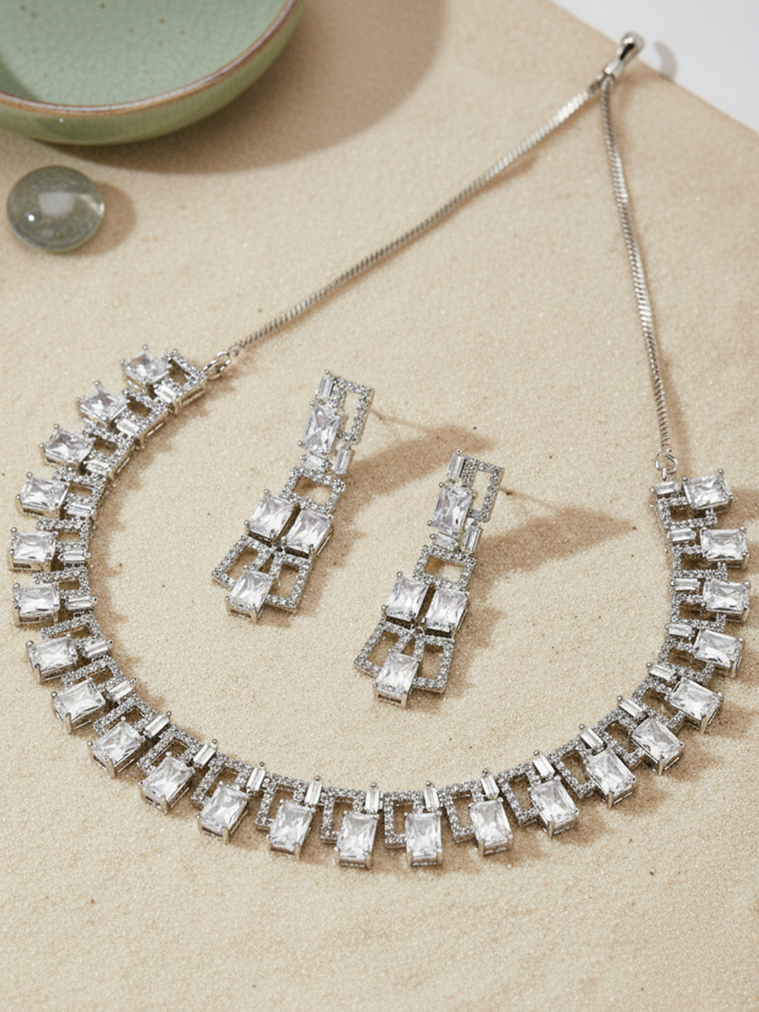 Silver Tone American Diamond Studded Necklace Set For Women. It is made with High-Quality AAA...