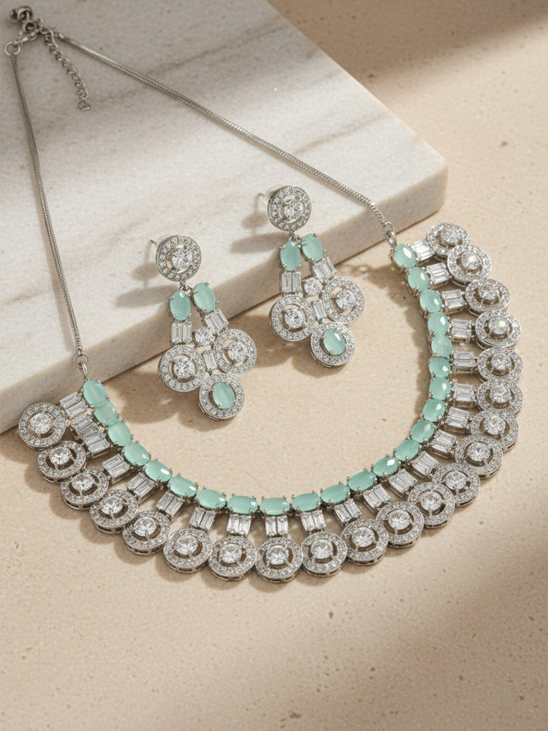 Silver Tone Light Green AD Necklace Set for Women . It is made with High-Quality...