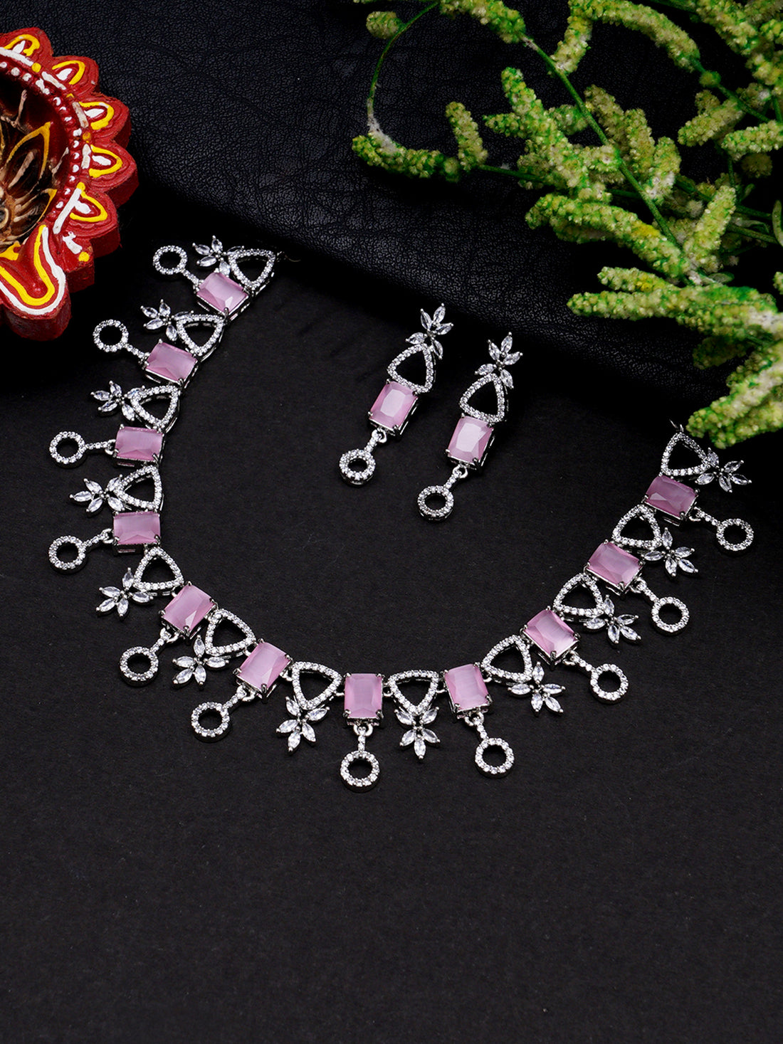 Silver Tone Pink Floral AD Necklace Set for Women. It is made with High-Quality AAA...