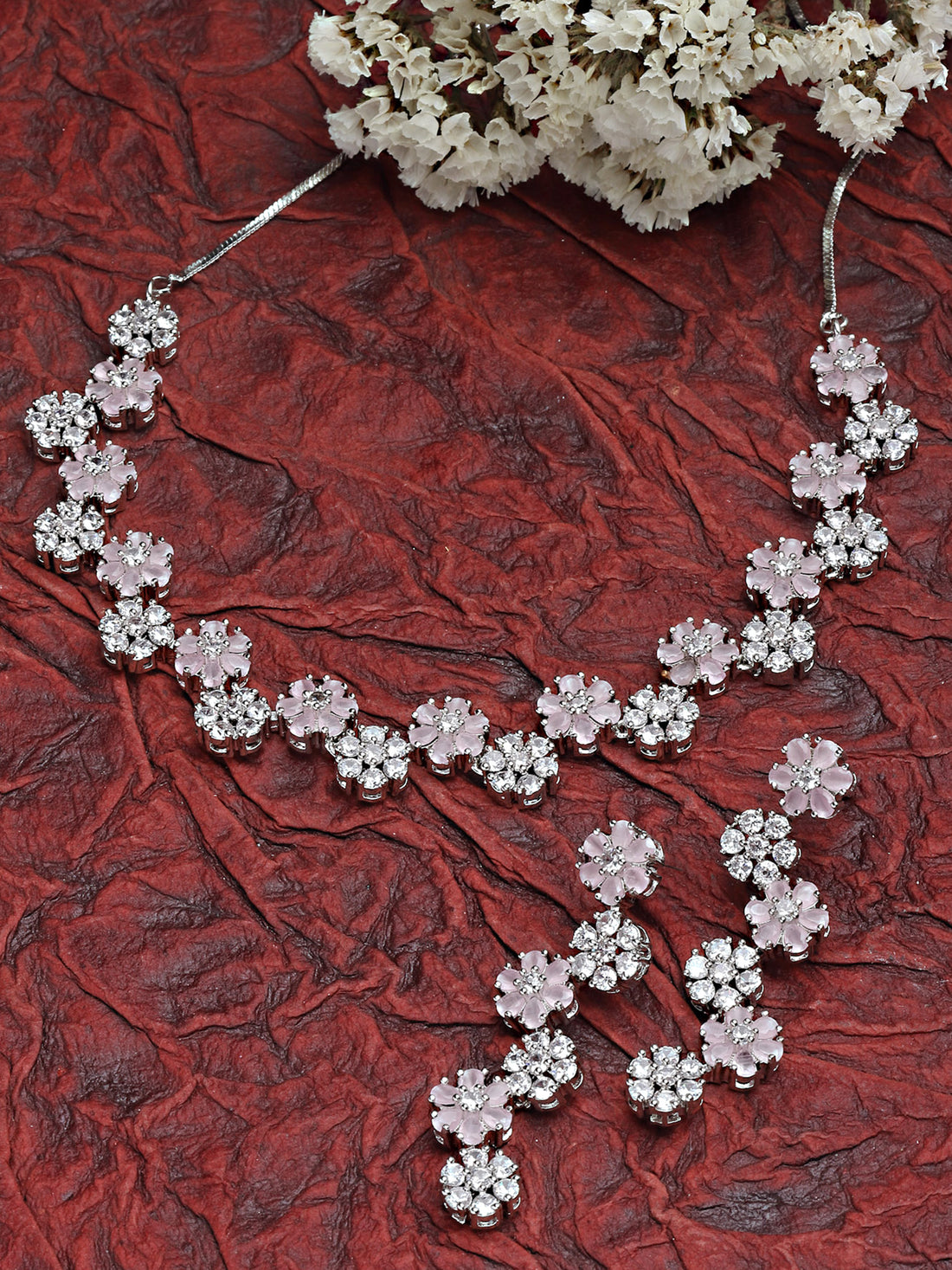 Karatcart Silver Tone Pink Floral AD Necklace Set for Women