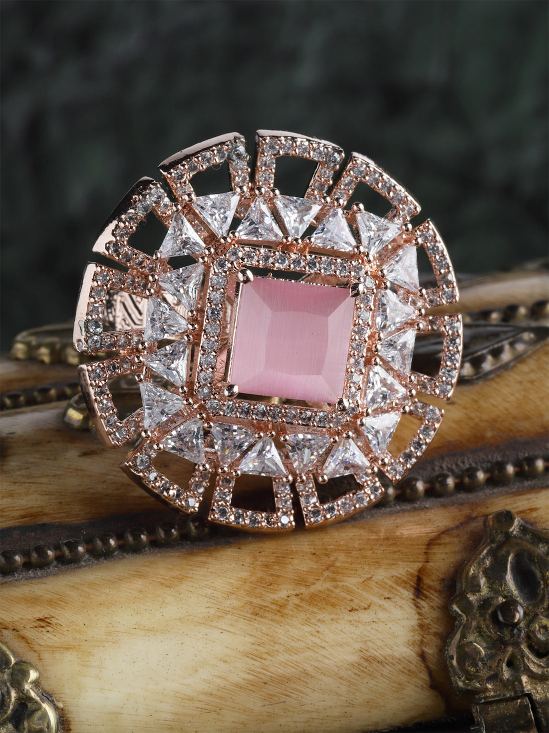 Pink American Diamond Studded Floral Adjustable Ring for Women