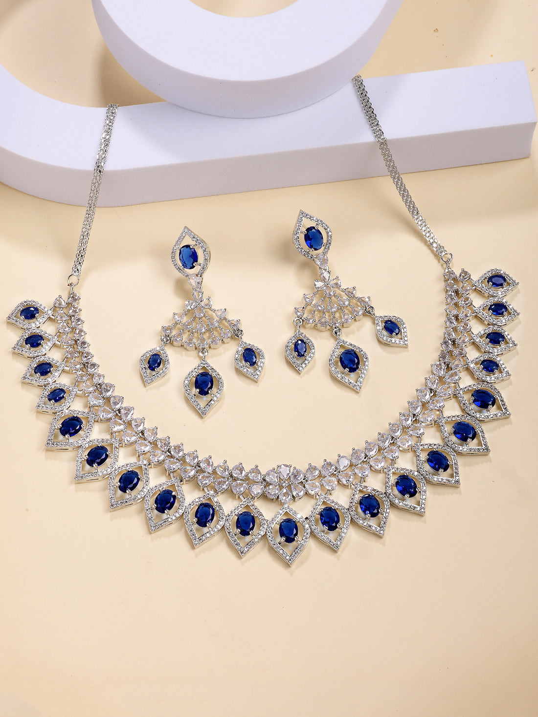 KARATCART Elegant Blue American Diamond Silver-Plated Premium Jewellery Set for Women