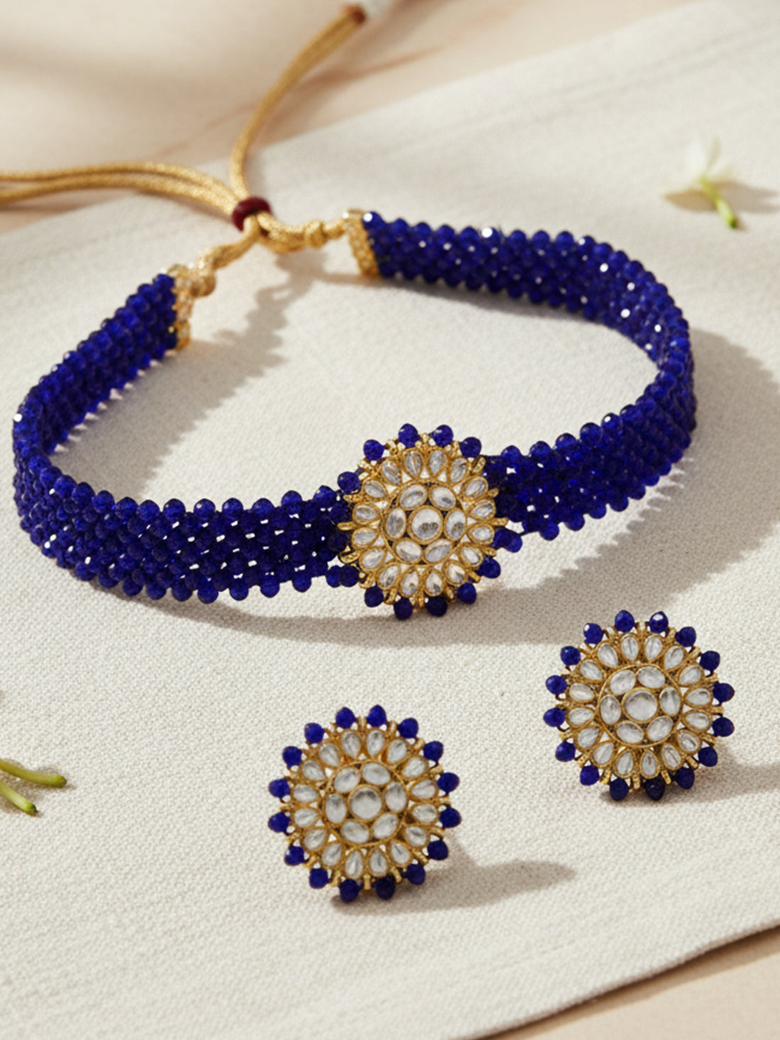 Karatcart Light Blue Crystal Beaded Choker Necklace Set. It is made with high-quality Kundan Stones...