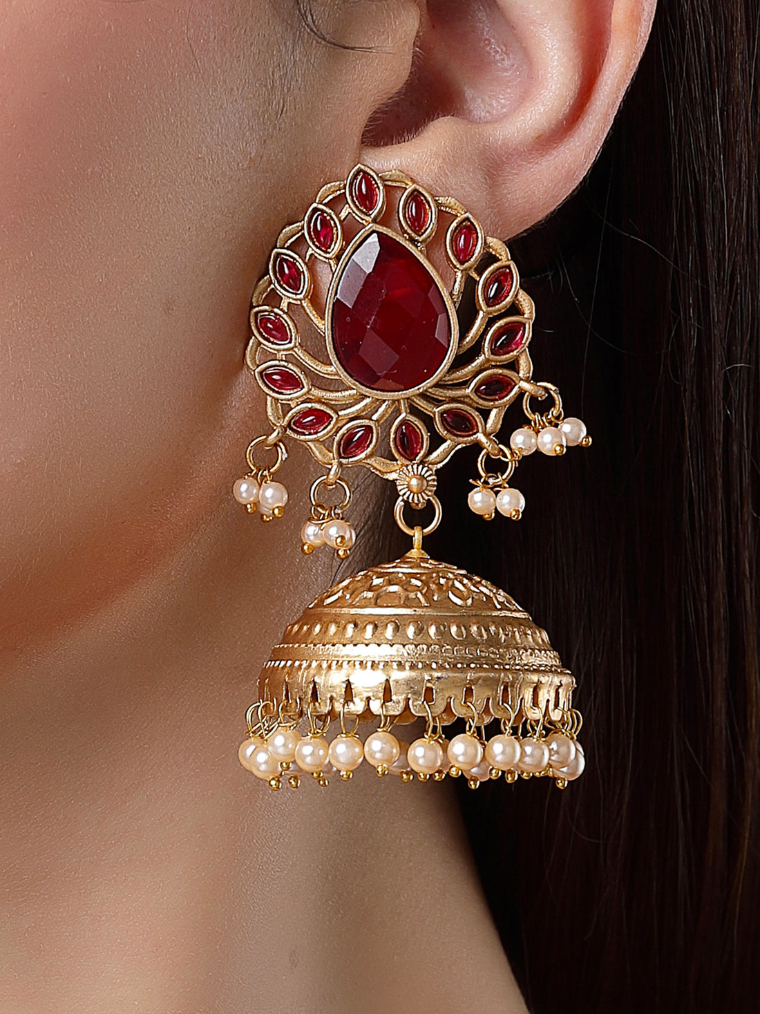 Karatcart Gold Plated Drop Shape Red Stone Studded Jhumki Earrings for Women