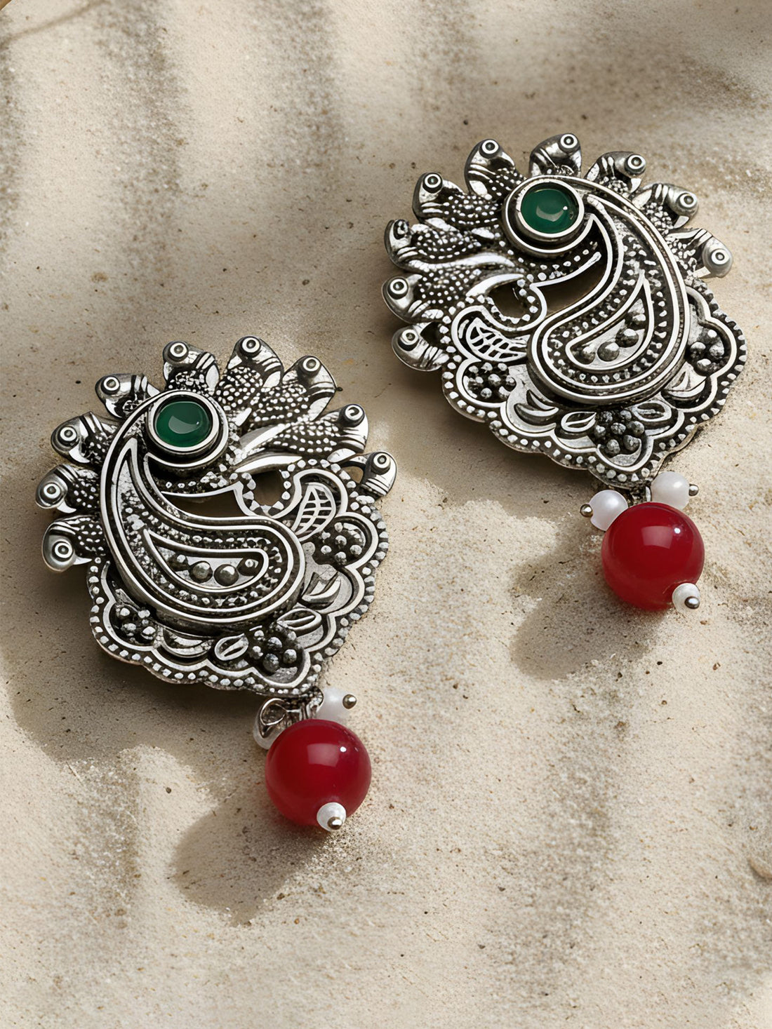 Karatcart Oxidised Silver Green Stone Red Bead Drop Earring for Women