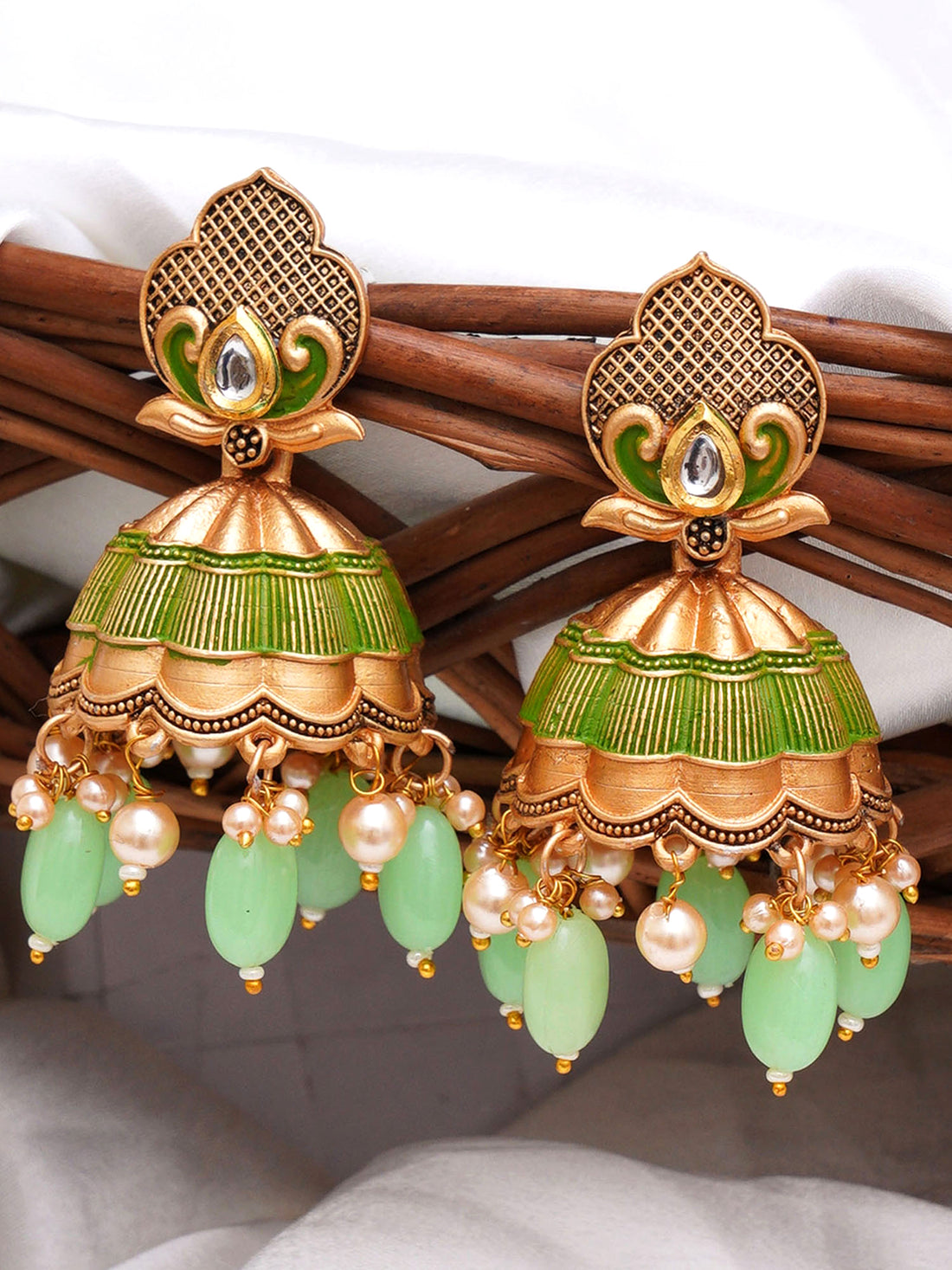 Karatcart Gold Plated Light Green Meena and Pearl Studded Jhumki Earrings for Women