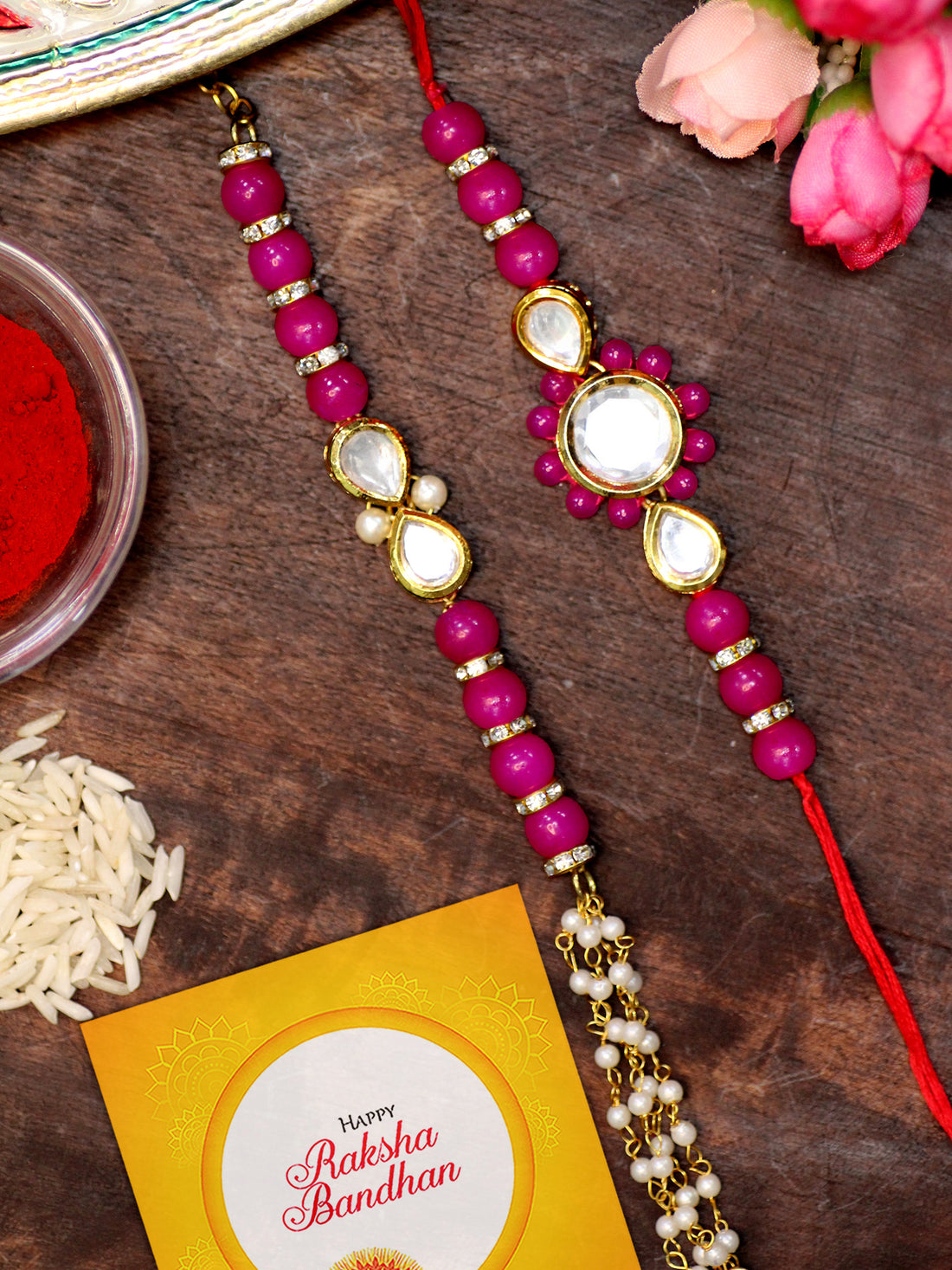 Karatcart Rakhi for Brother and Bhabhi Set of 2 Gold Plated Pink Beads Polki Kundan Bhiya Bhabhi Rakhi Combo with Roli & Chawal