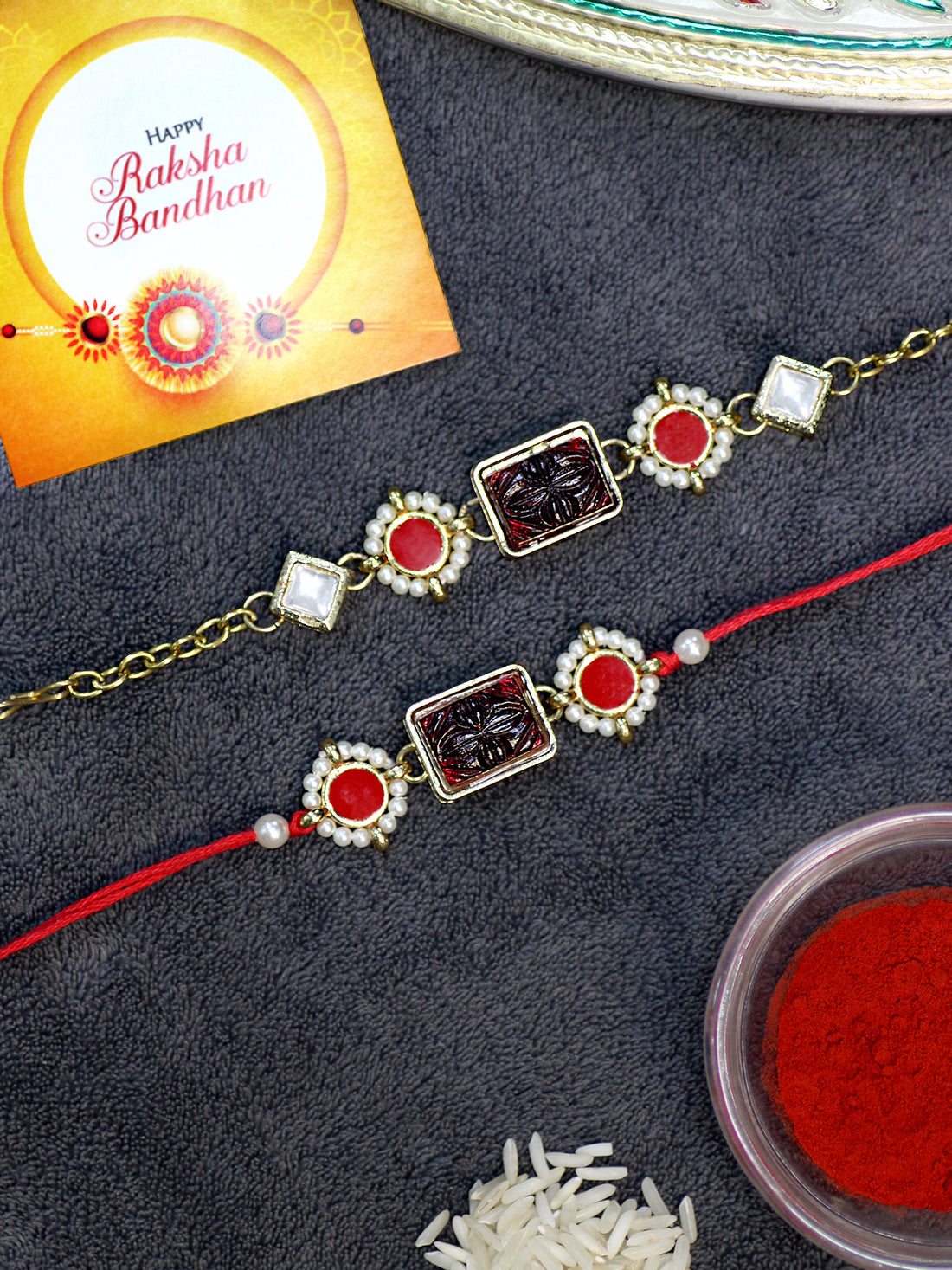Karatcart Rakhi for Brother and Bhabhi Set of 2 Gold Plated Red Carved Stone and Pearl Kundan Bhiya Bhabhi Rakhi Combo with Roli & Chawal