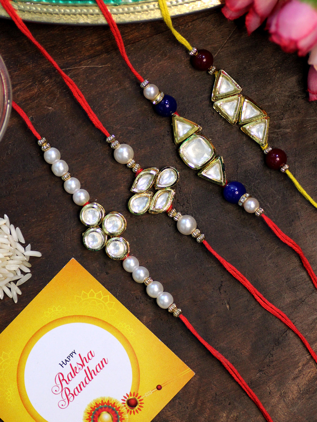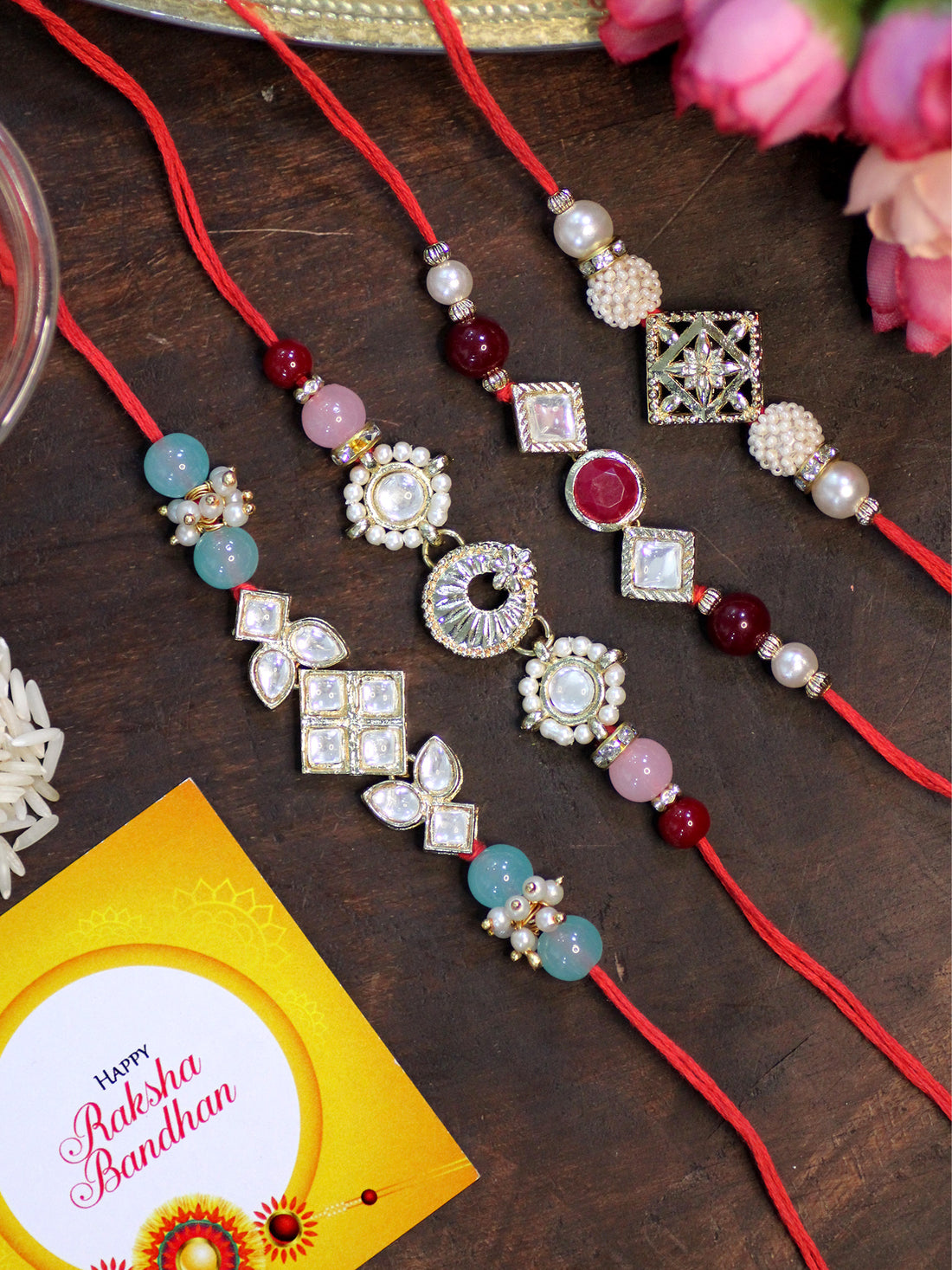 Karatcart Rakhi for Brother Set of 4 Gold Plated Handmade Polki Kundan Rakhi with Roli & Chawal