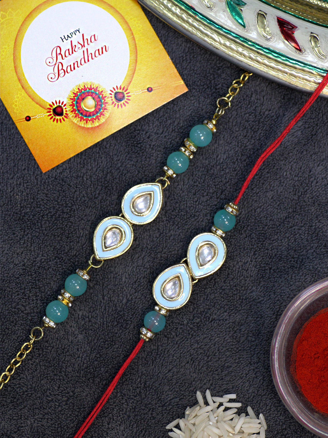 Karatcart Rakhi for Brother and Bhabhi Set of 2 Gold Plated Light Blue Handmade Kundan Bhiya Bhabhi Rakhi Combo with Roli & Chawal