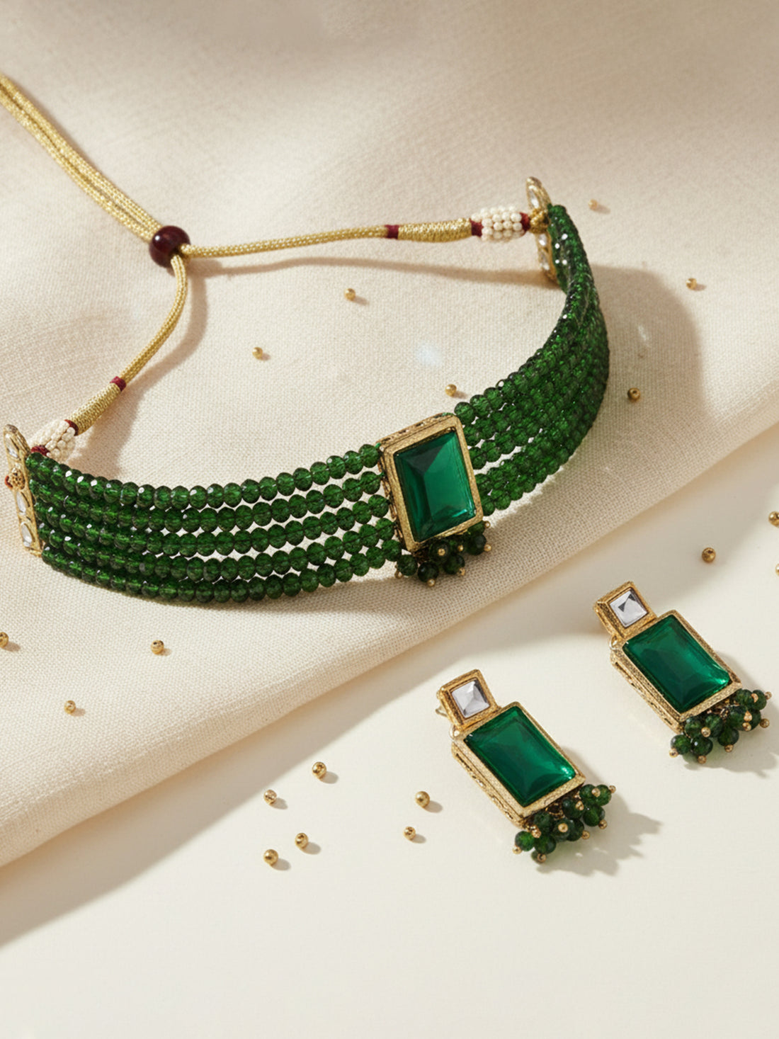 Green Multistrand Embellished Kundan Choker Necklace Set