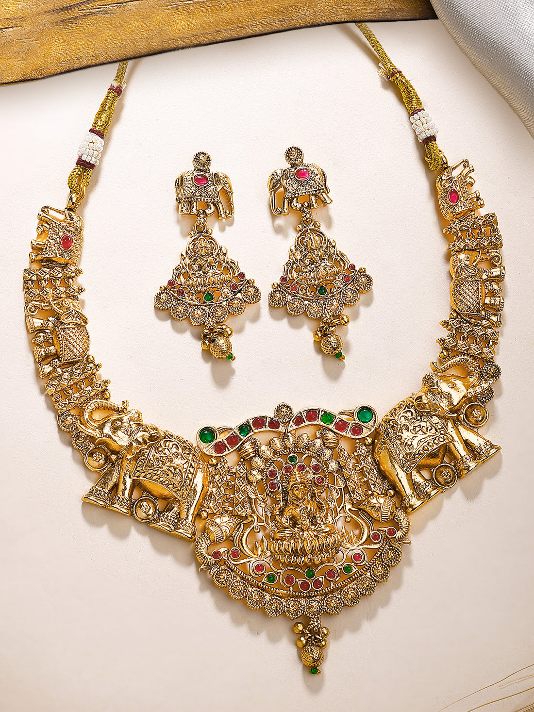 KARATCART Traditional Gold-Plated South Indian Laxmi Mata Motif Temple Jewellery Set for Women
