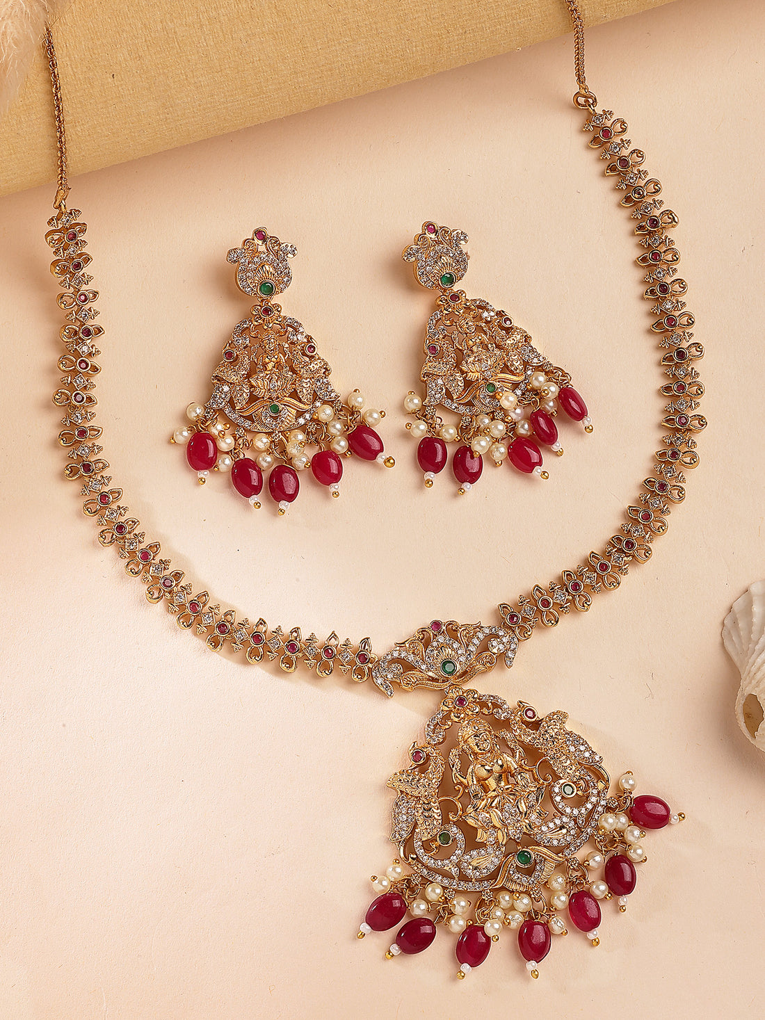 KARATCART Traditional Gold Plated Red Stone Laxmi Mata Temple Jewellery Set for Women