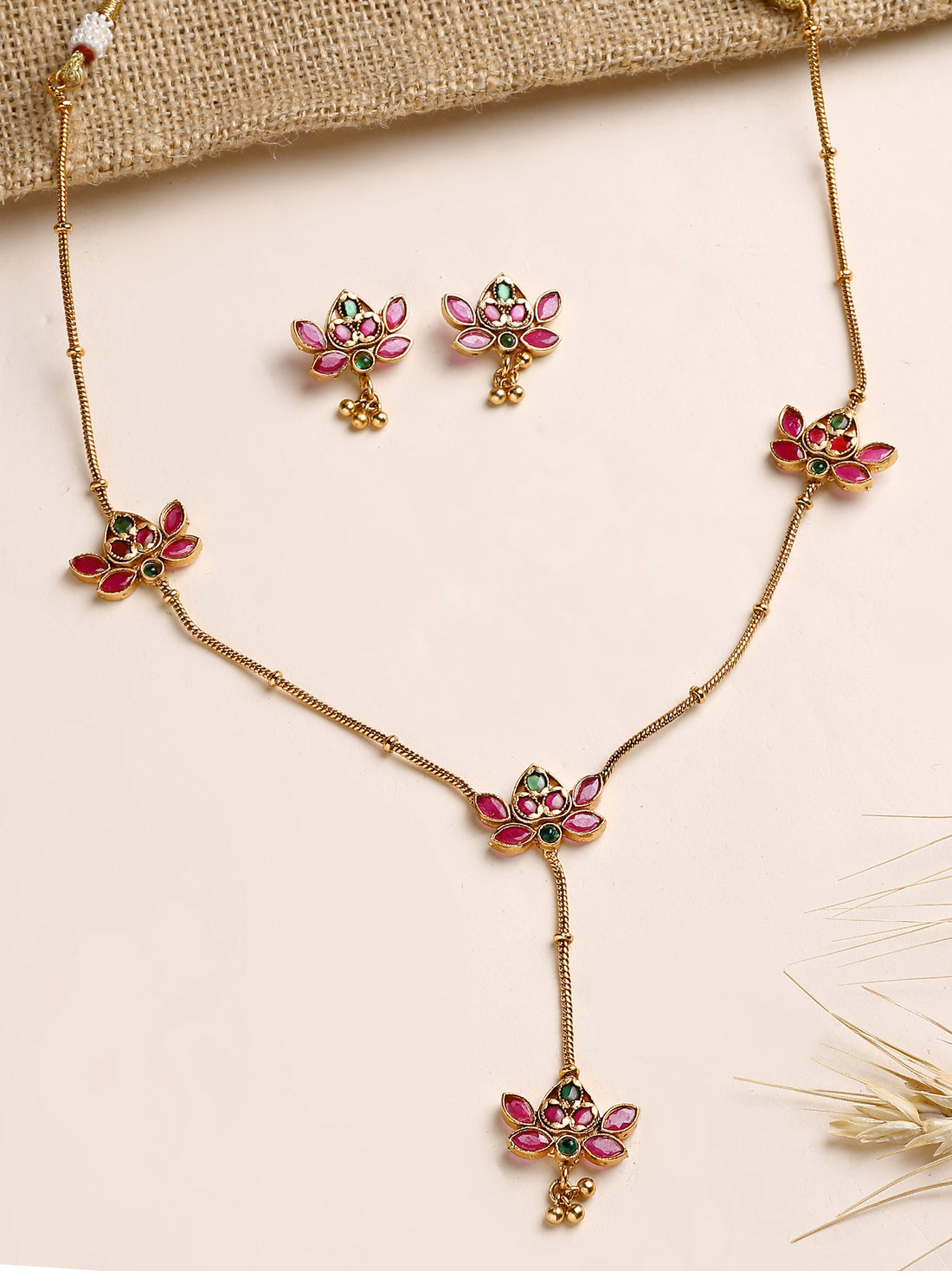 KARATCART Minimalist Gold-Plated Red and Green Stone Lotus Design Necklace Set for Women