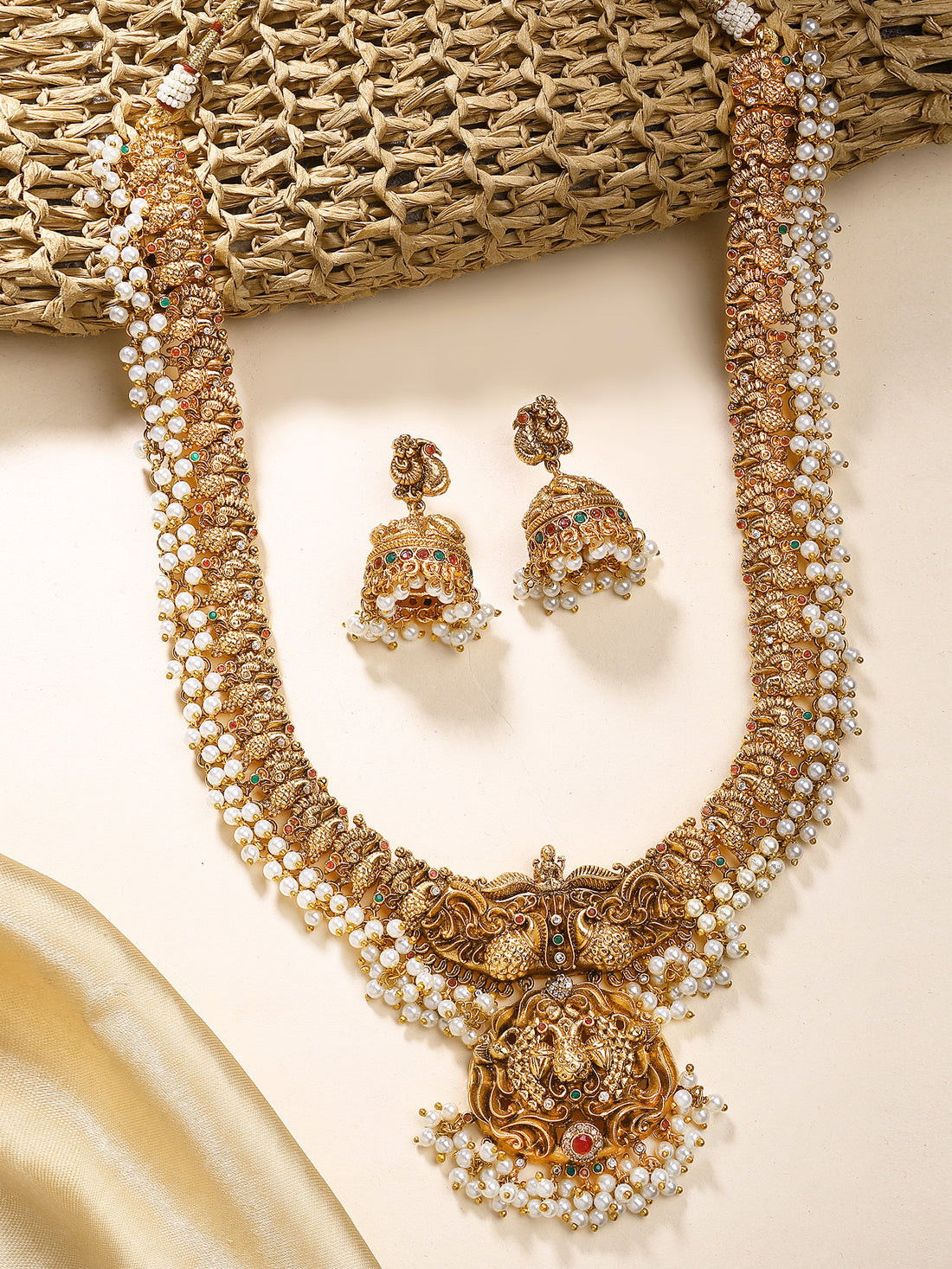 KARATCART Gold-Plated Pearl-Embellished Goddess Laxmi Temple Jewellery Set for Women