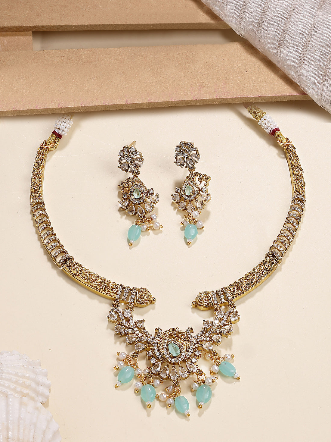 Karatcart Dazzling Light Blue Tumble American Diamond Peacock Design Necklace Set for Women