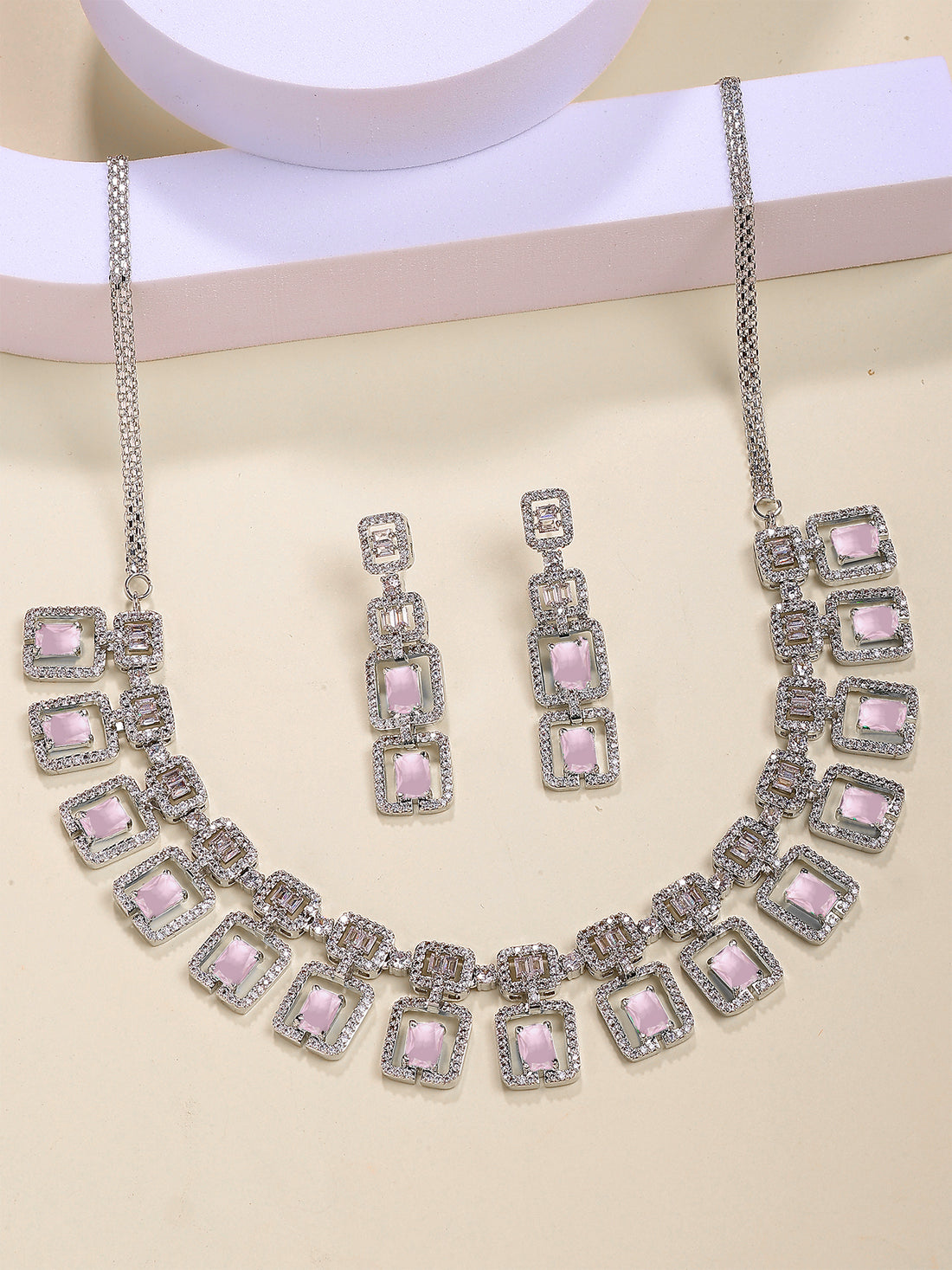 Karatcart Dazzling Silver Plated Pink Square American Diamond Necklace Set for Women