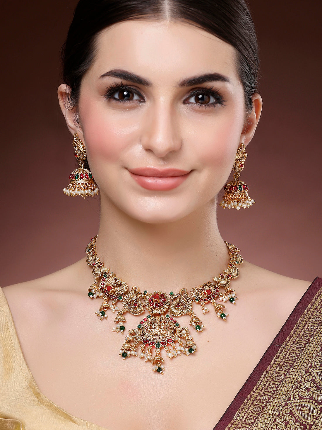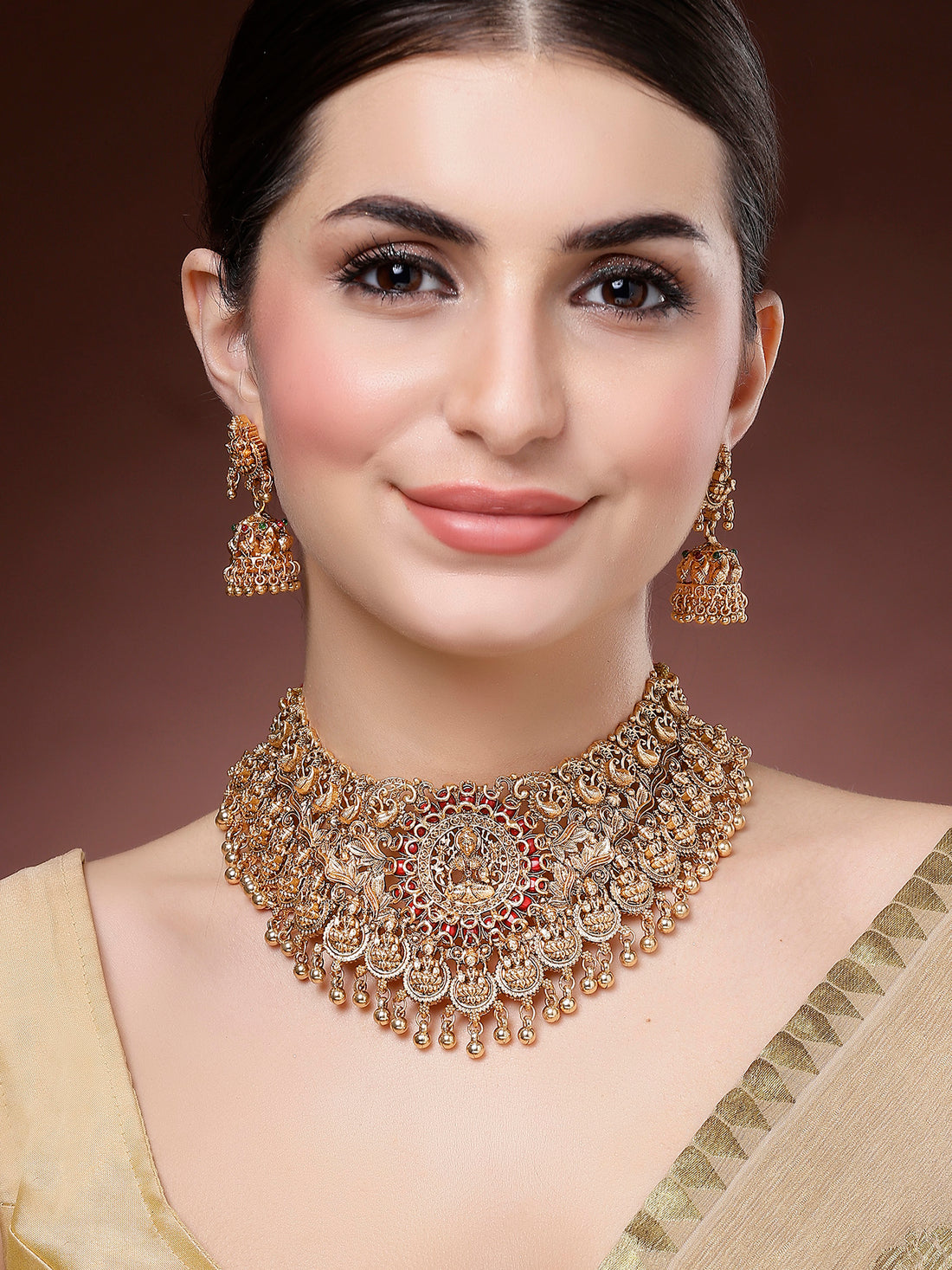 Karatcart Gold Plated Red Beads Laxmi Mata and Peacock Design Choker Necklace Set for Women....