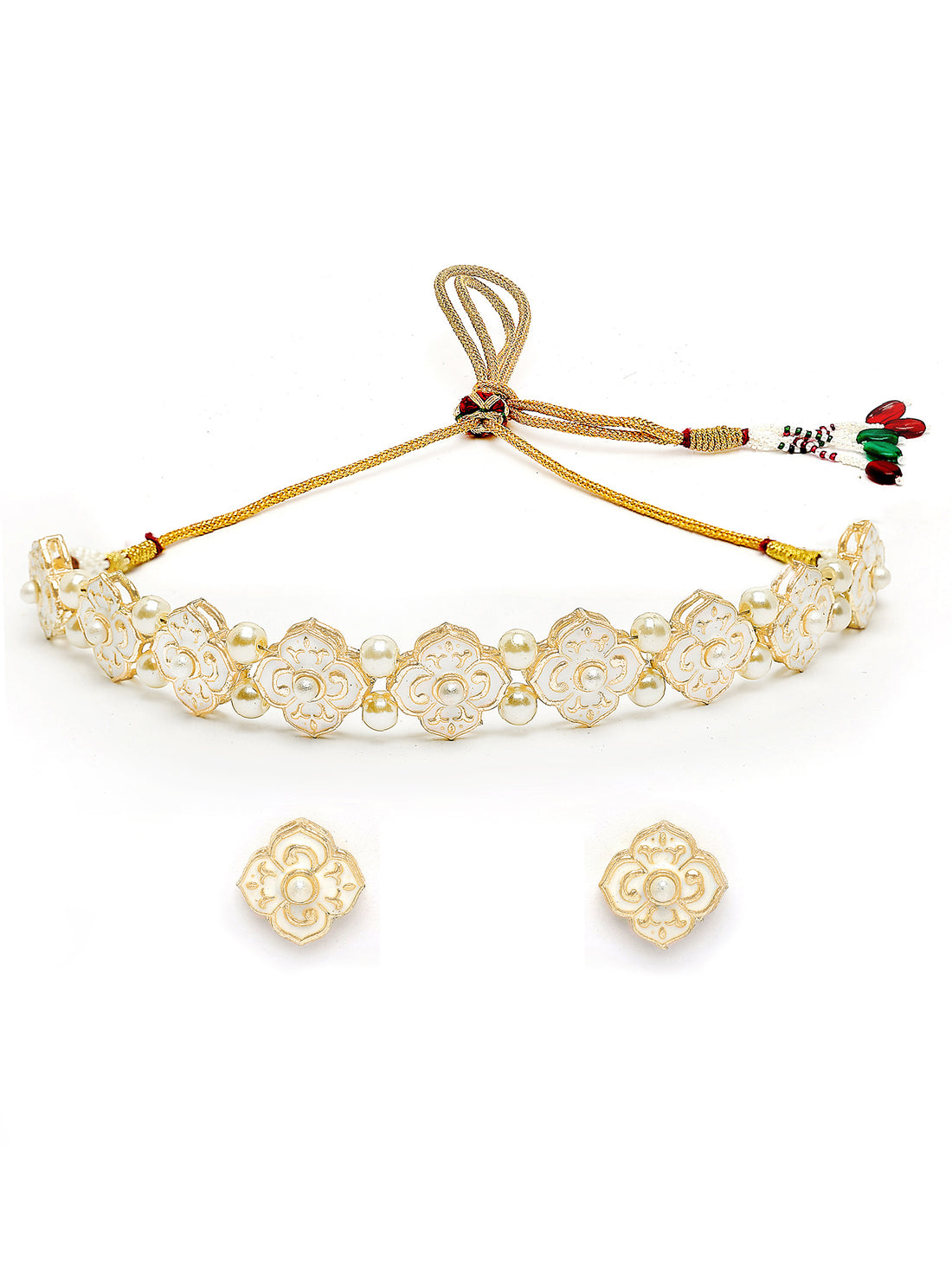 Karatcart Gold Plated White Enamel Pearl Choker Necklace Set for Women