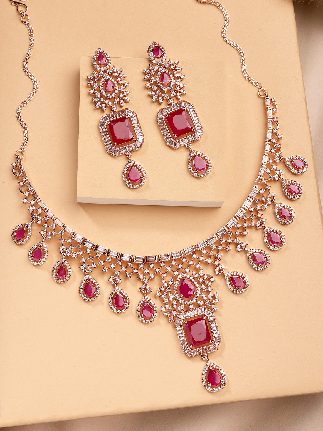Karatcart Rose Gold Plated Red Stone American Diamond Necklace Set for Women