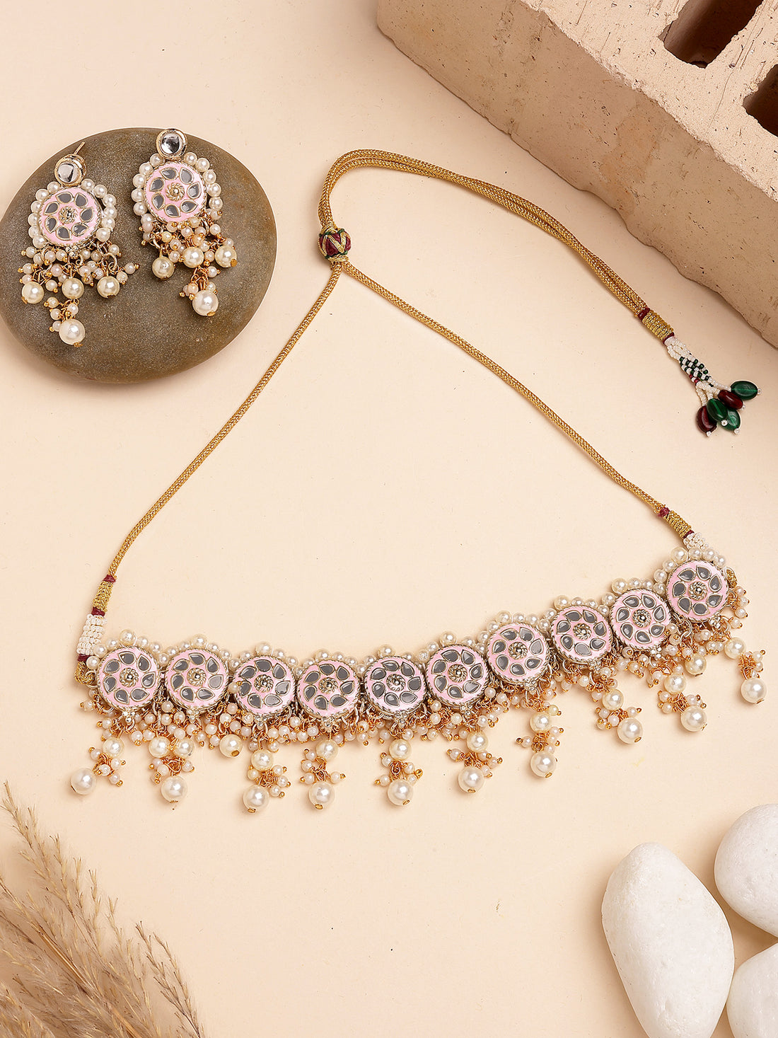 Karatcart Gold Plated Pink & Grey Meena Kundan Choker Necklace Set for Women
