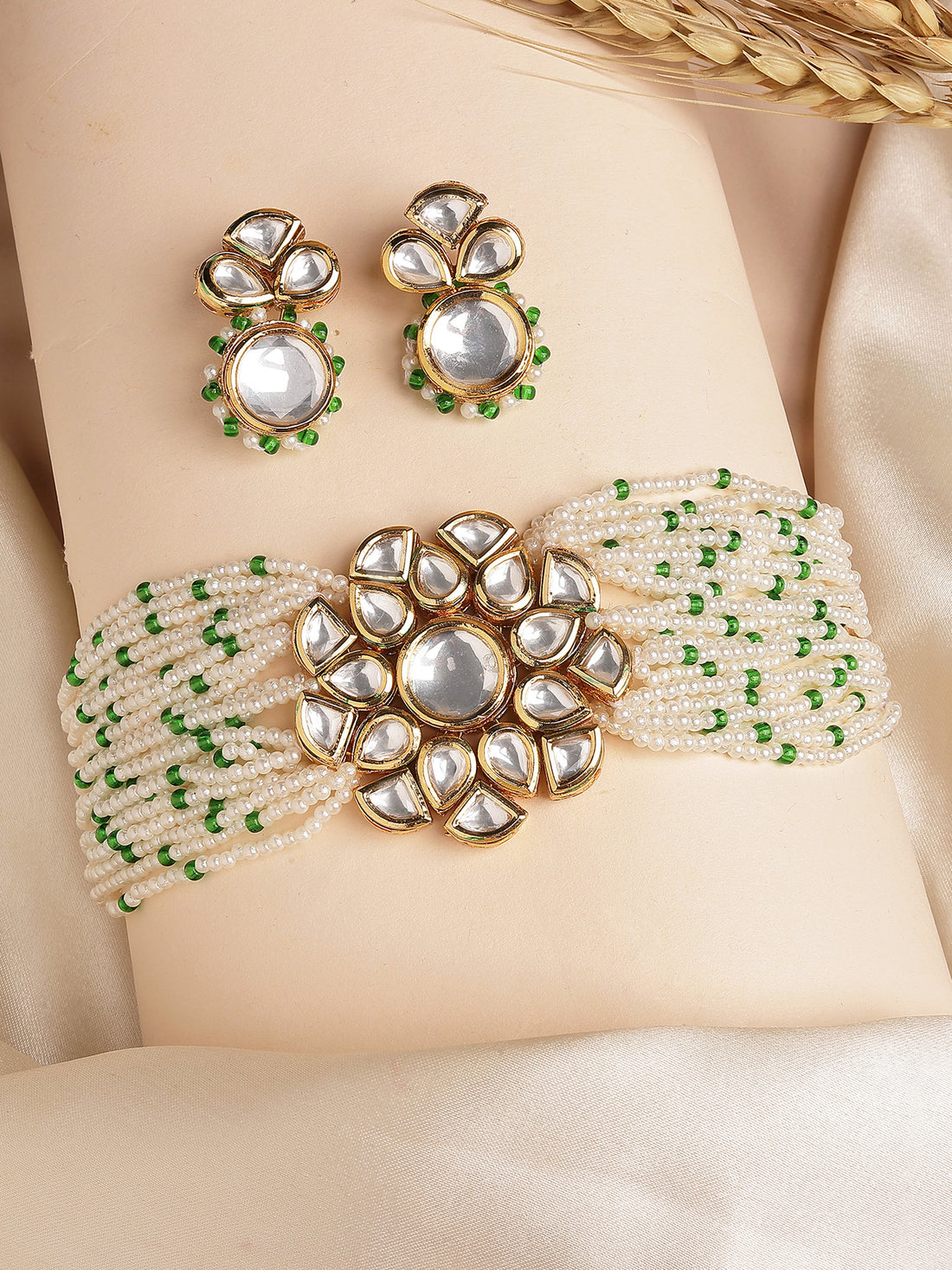 Karatcart Green Beads Polki Kundan Floral Design Choker Necklace Set for Women