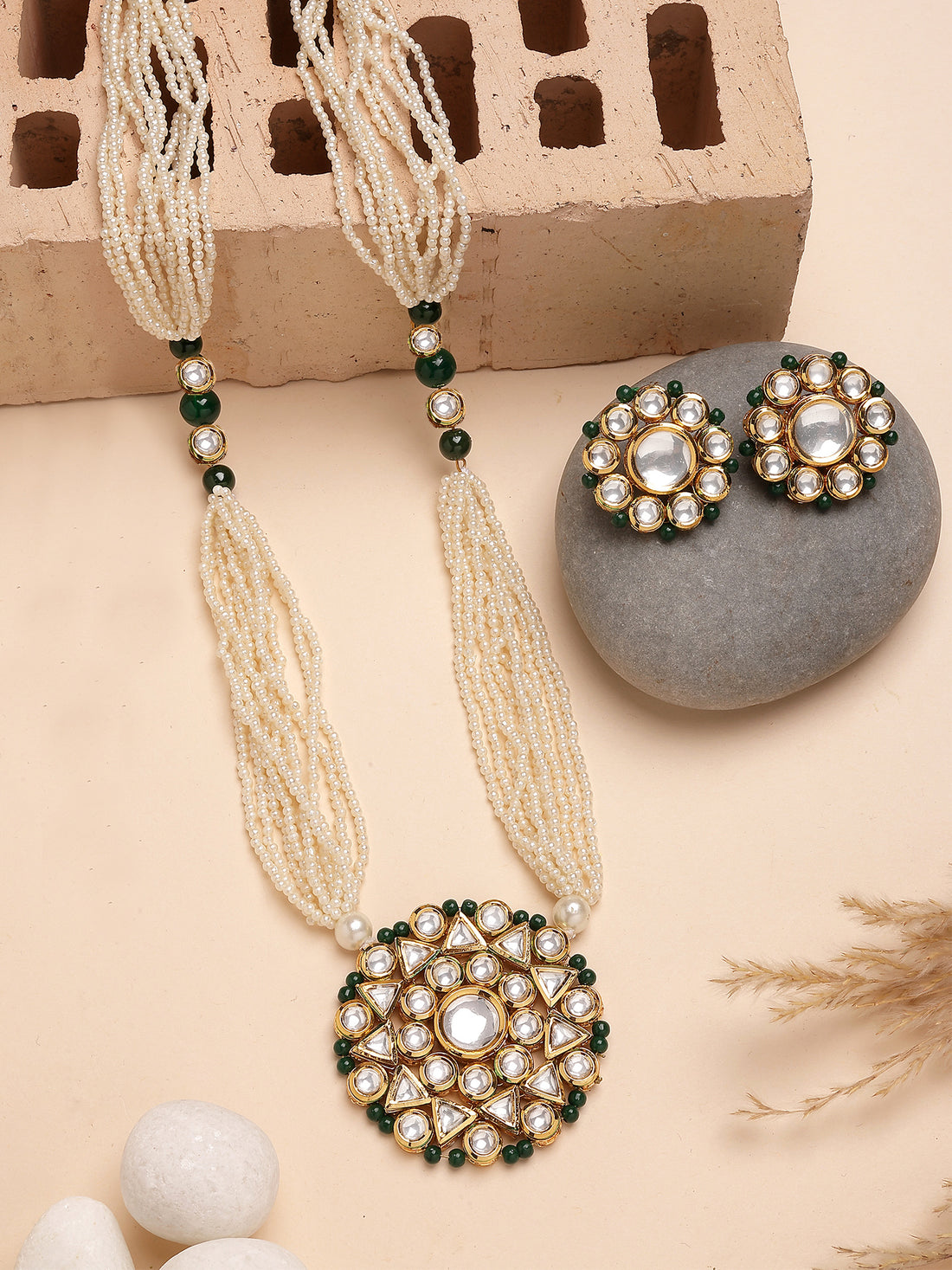 Karatcart Green Beads Polki Kundan Long Rani Haar Necklace Set for Women