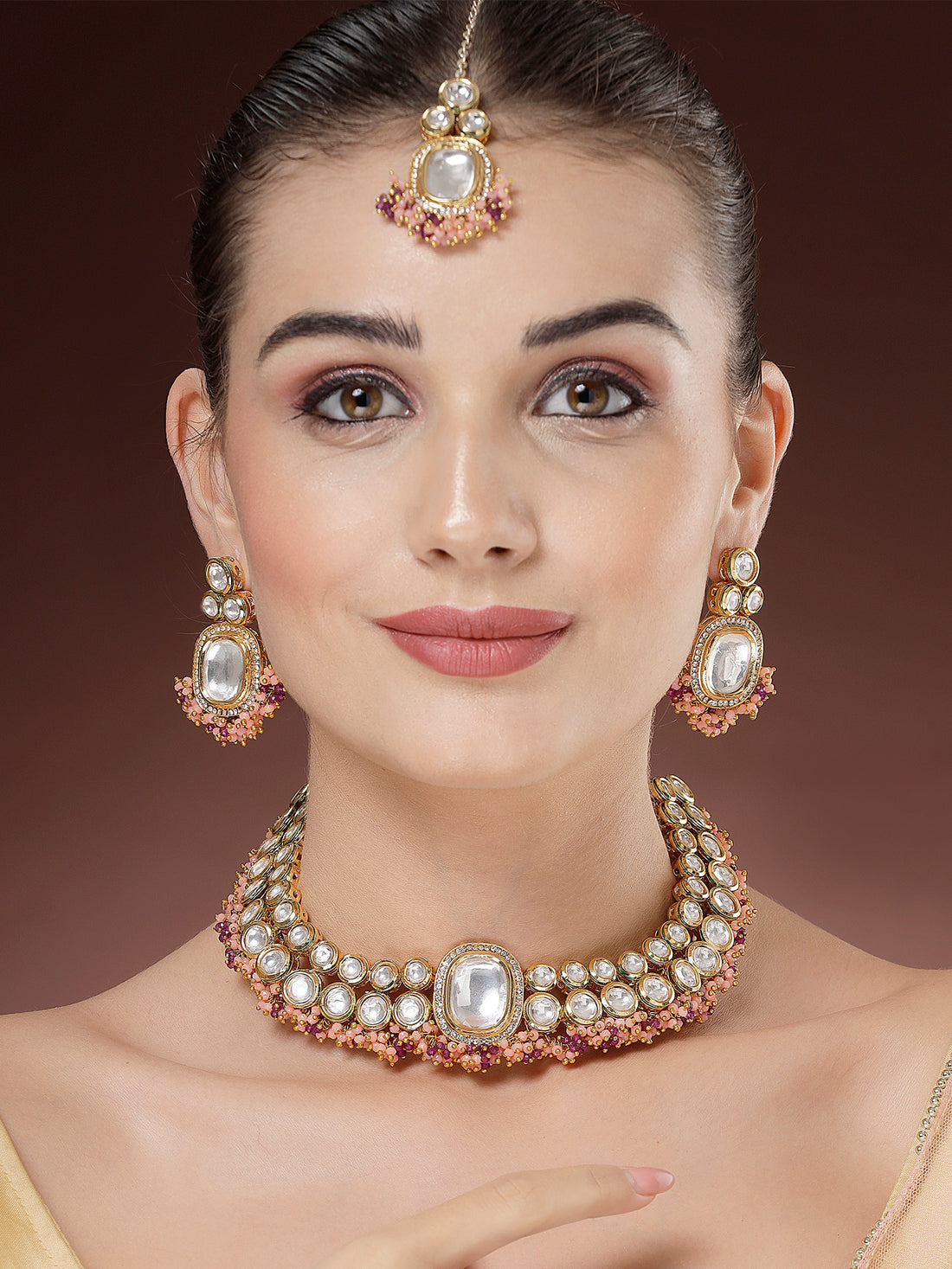 Karatcart Gold Plated Pink Stone & Bead Ethnic Indian Traditional Kundan Dulhan Bridal Jewellery Set
