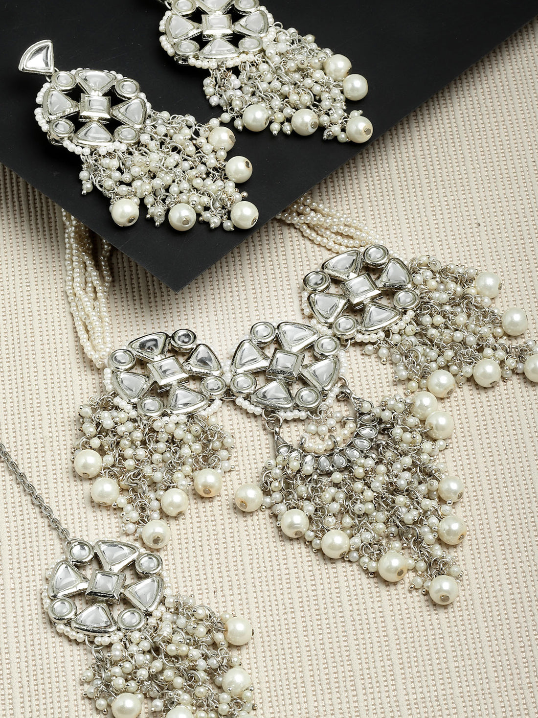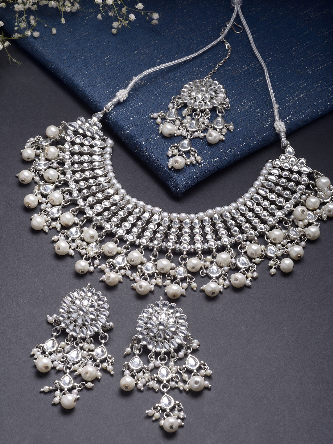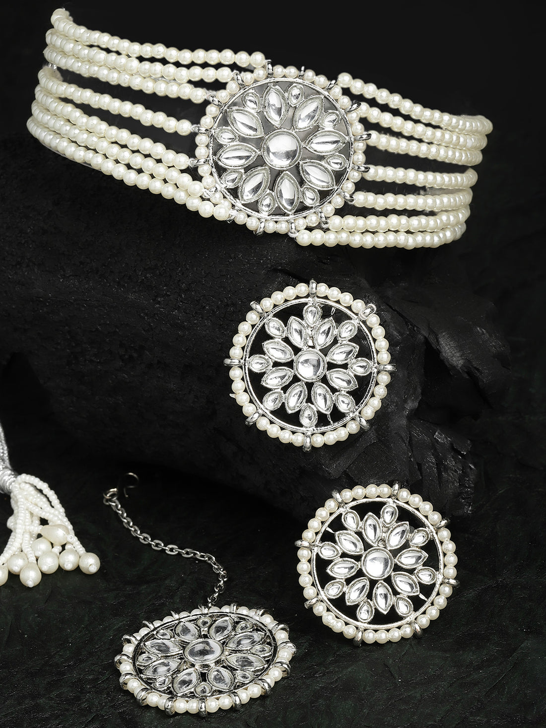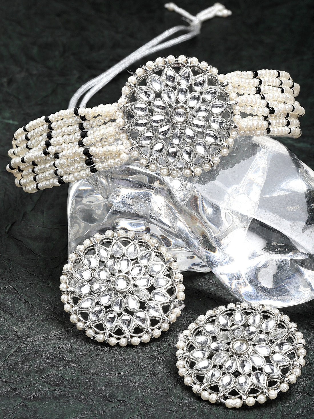 Karatcart Pearl Beaded Oxidised Silver Kundan Choker Necklace Set