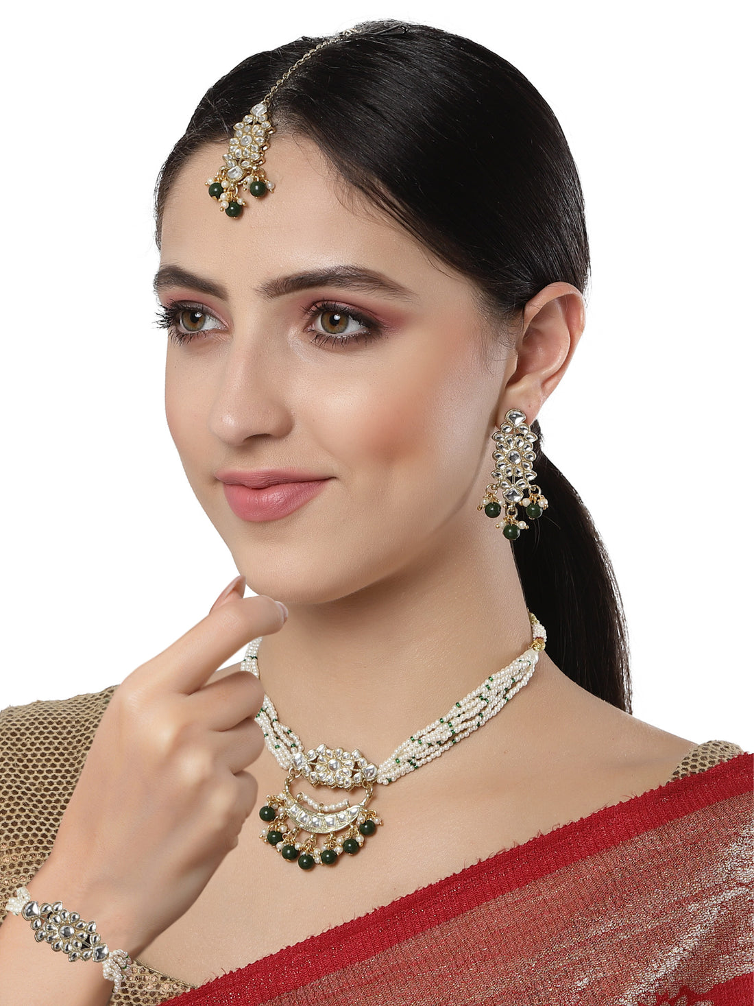 Karatcart Gold Plated Green Bead Studded Kundan Choker Neckalce Set with Bracelet