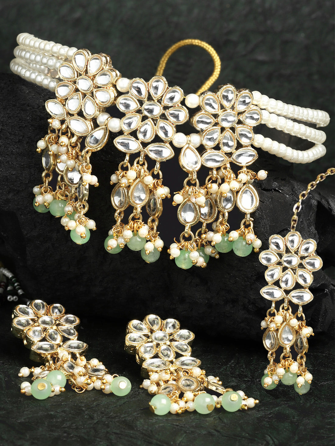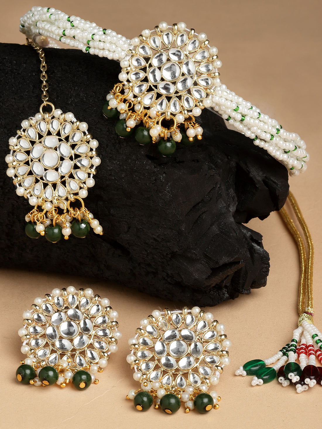 Karatcart Gold Plaed Light Green Beads Studded Floral Kundan Choker Neckalce Set