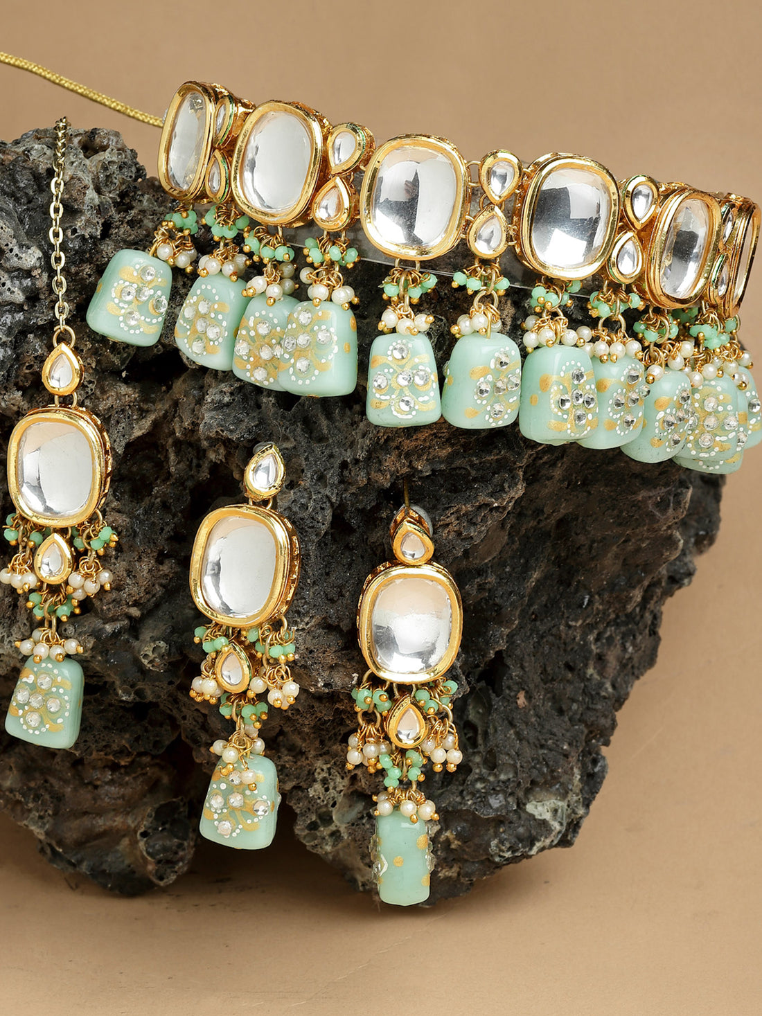 Karatcart Gold Plaed Light Green Beads Studded Floral Kundan Choker Neckalce Set. It is made...