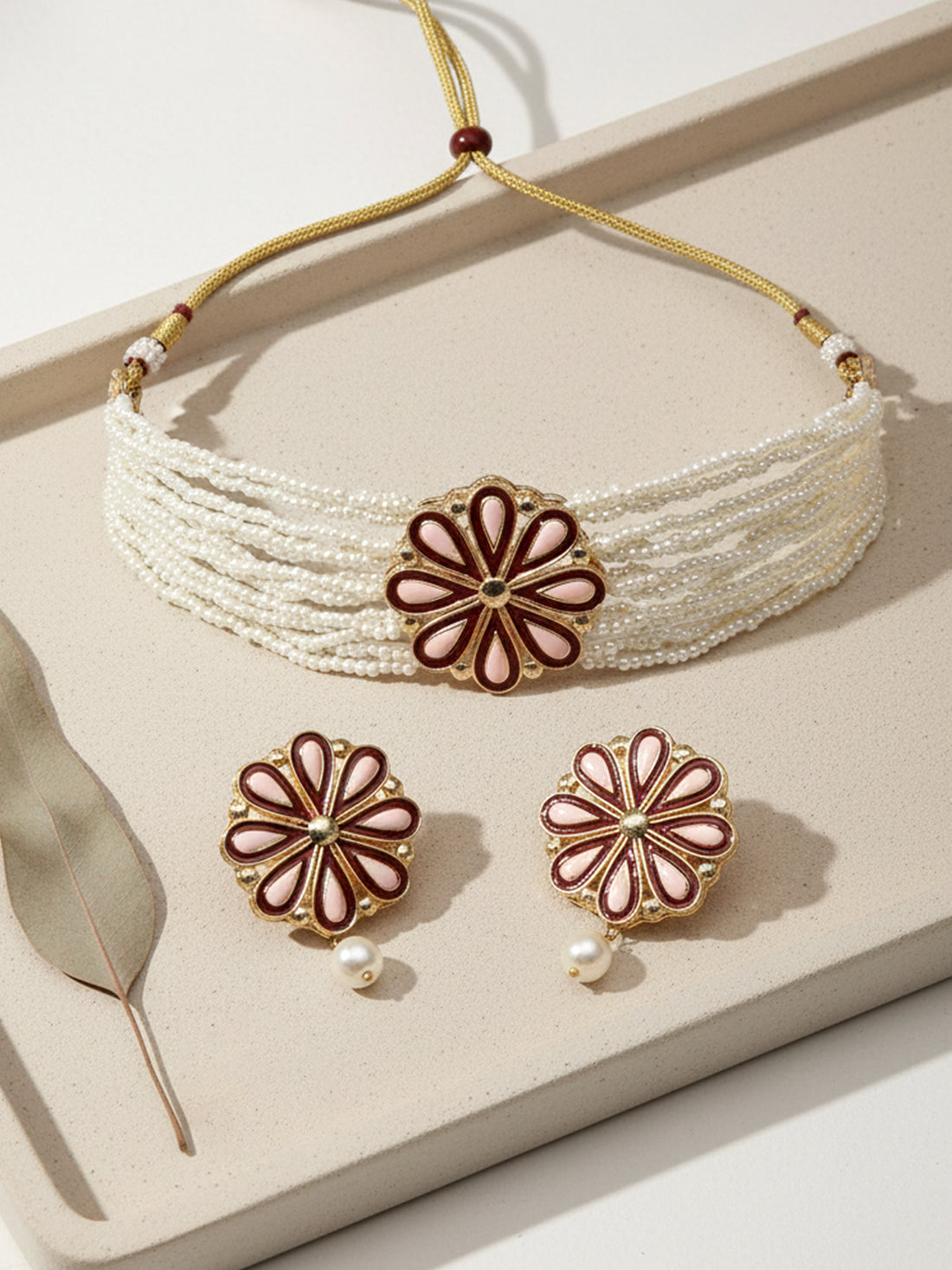 Karatcart Gold Plated Maroon Meena Floral Pearl Beaded Kundan Choker Necklace Set for Women